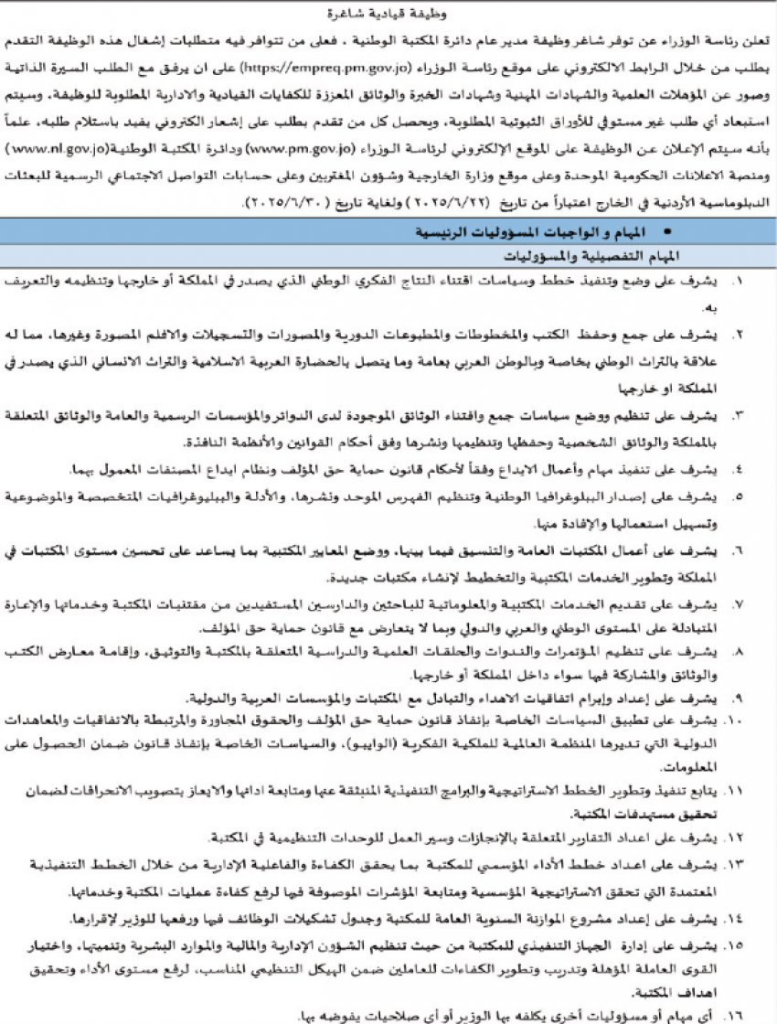 للعلّم - أعلنت رئاسة الوزراء عن توفر شاغر لوظيفة مدير عام دائرة المكتبة الوطنية، داعيةً من تتوافر فيه متطلبات إشغال هذه الوظيفة إلى التقدّم بطلب من خلال الرابط الالكتروني على موقع رئاسة الوزراء https://empreq.pm.gov.jo).