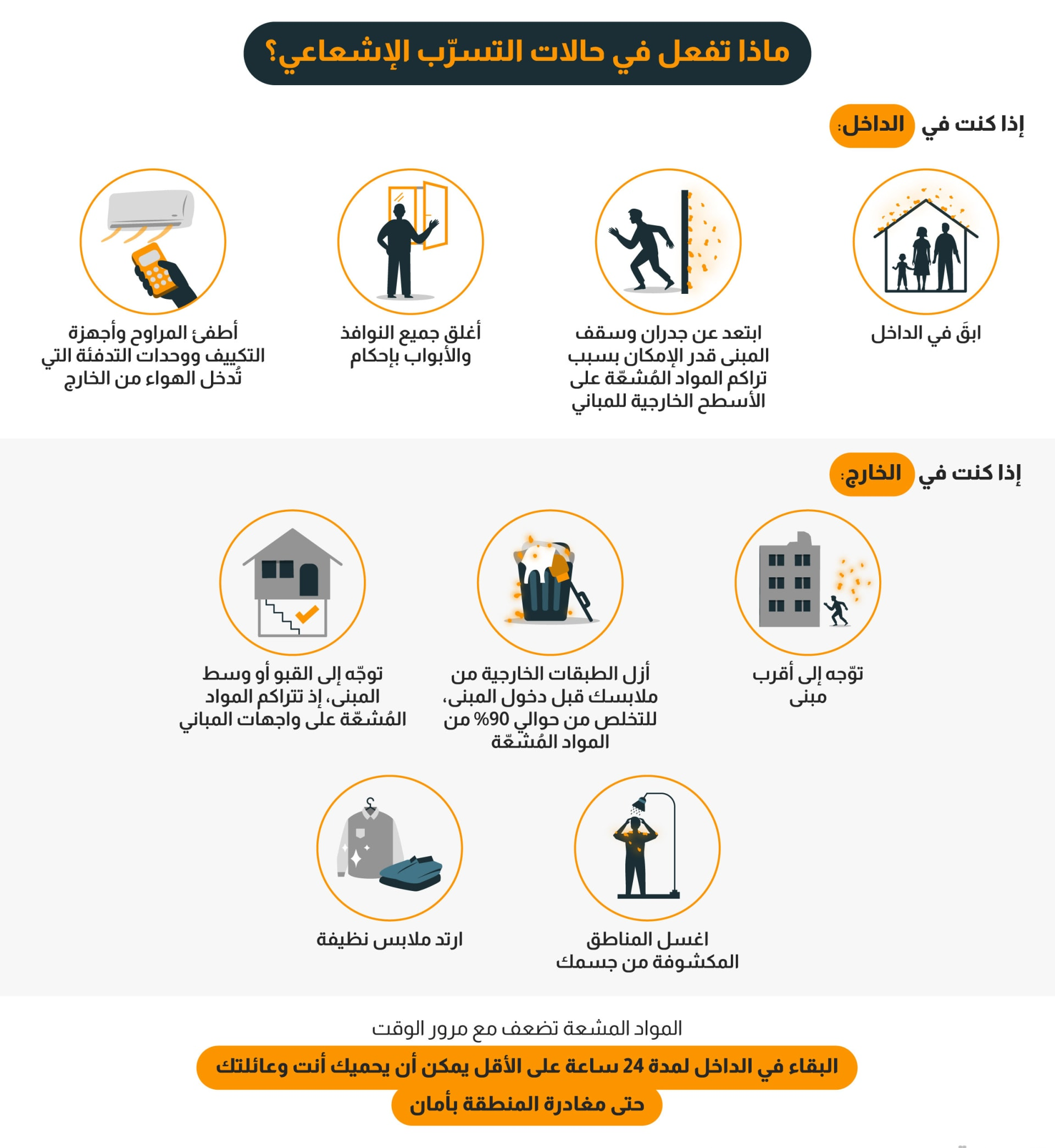 نشر الموقع الإلكتروني الرسمي للمراكز الأمريكية للسيطرة على الأمراض والوقاية منها قائمة بأبرز الأمور التي يجب أخذها في عين الاعتبار عند حدوث تسرّب إشعاعي.