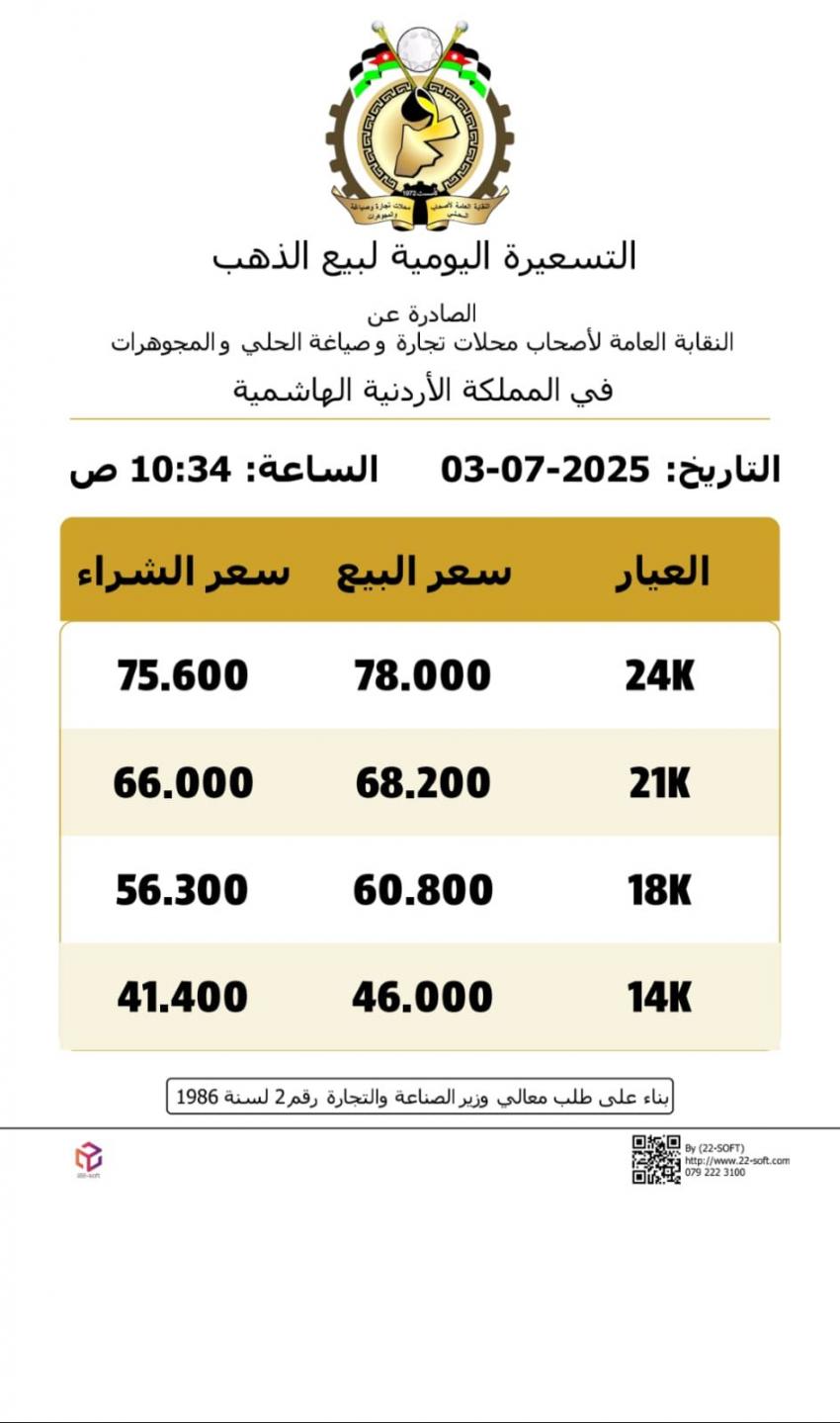 أما أسعار شراء غرام الذهب لعيارات 24 و18 و14 في محلات الصاغة، فقد بلغت 78 دينارًا، و60.80 دينارًا، و46 دينارًا على التوالي.