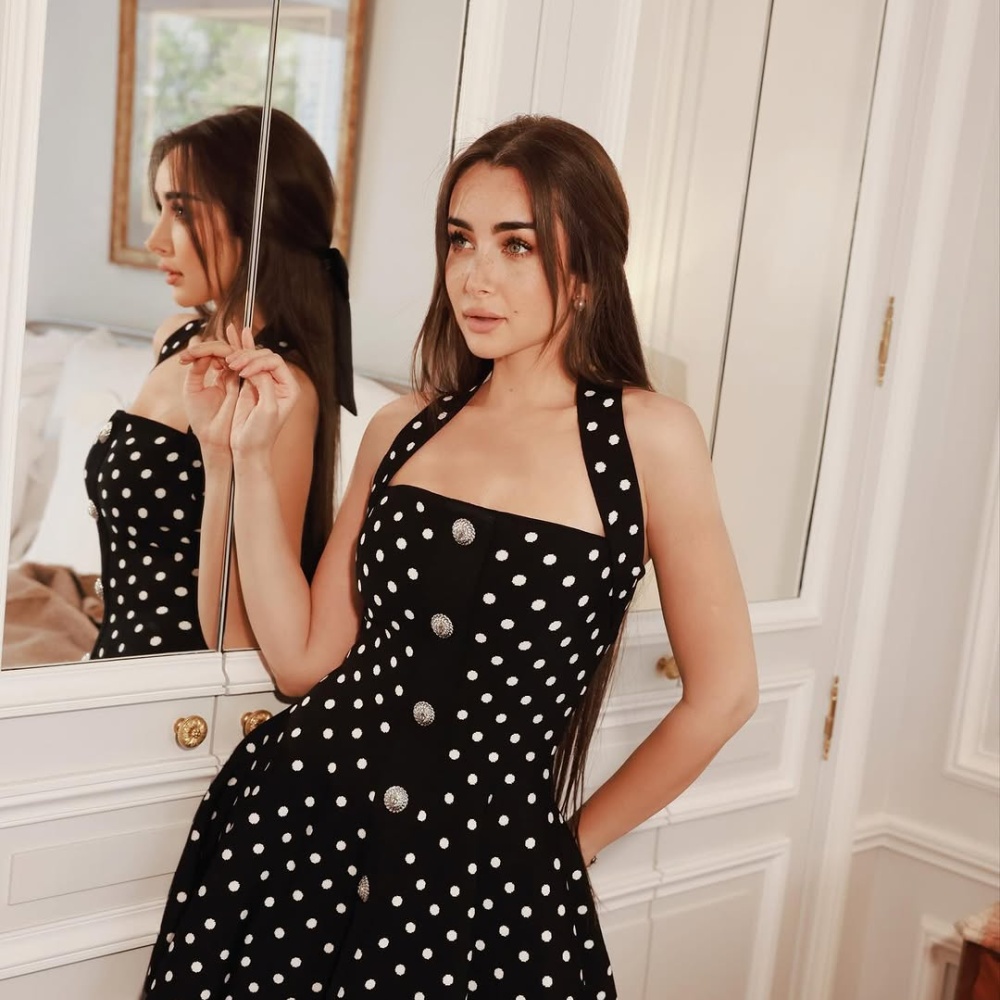 اختارت هنا الزاهد فستانا قصيرا باللون الأسود مزينًا بنقاط البولكا دوت البيضاء، وهو تصميم يحمل توقيع دار الأزياء العالمية Balmain. الفستان تميز بقصة مميزة: ياقة مربعة تُبرز الكتفين بشكل أنيق، وحمالات عريضة تلتف حول الرقبة لتُشكل قصة "هالتر" جذابة.