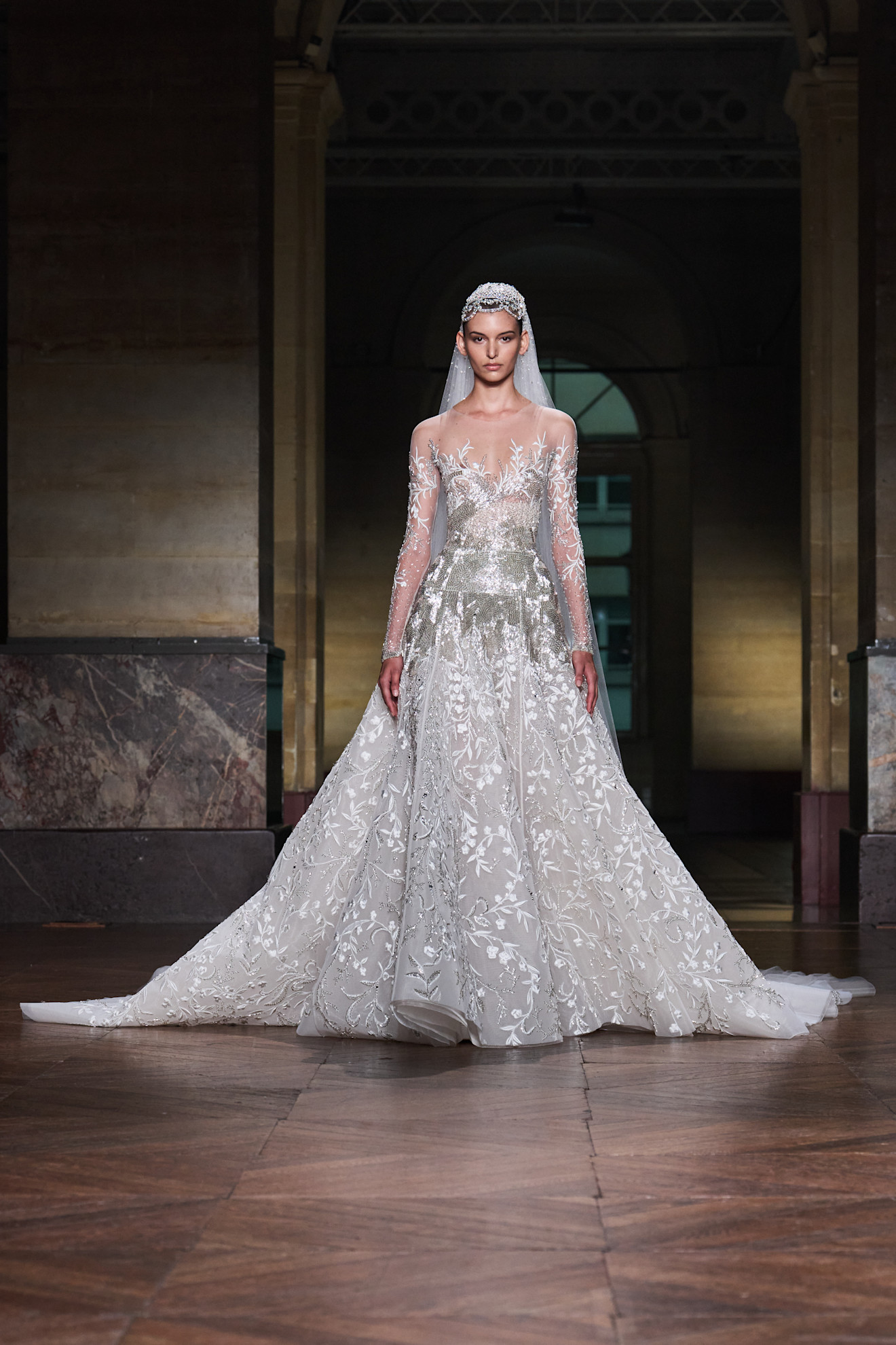 اختُتم عرض إيلي صعب بفستان عروس أسطوري من حرير اللوميه بلون اللؤلؤ، مزدان بتطريزات ثلاثية الأبعاد وكريستالات متلألئة، وطرحة ملكية تنساب بهدوء ملكي. التنورة المزدانة بالكشاكش المنحوتة عند الخصر منحت التصميم بعداً دراميًا فخمًا.