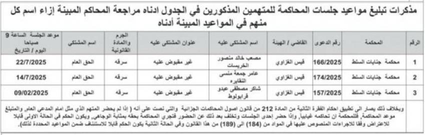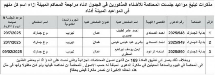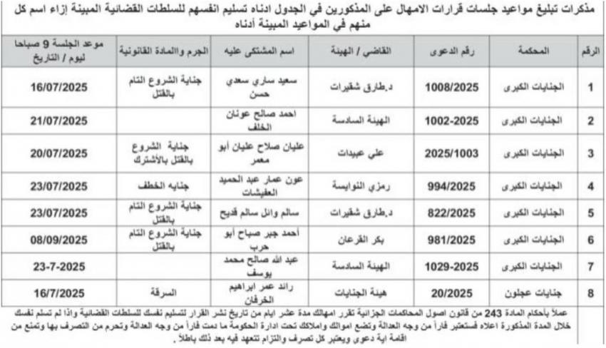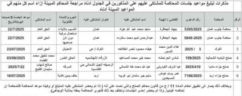 مذكرات تبليغ مواعيد جلسات محاكمات لأردنيين