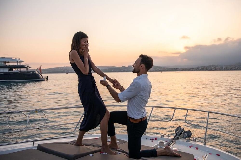 خلال اللحظة الخاصة، ركع طالبًا الزواج منها، بينما ظهر مركب آخر يحمل لافتة ضخمة كُتب عليها: "Say Yes" – قولي نعم". وبعد موافقتها، احتفل الثنائي وسط الأمواج في لحظة خيالية.