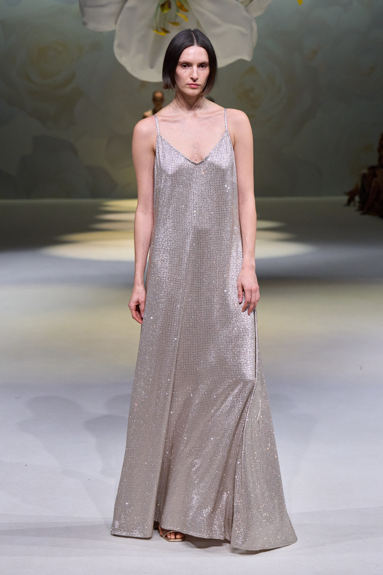 القماش البراق من صيحات فساتين سهرة صيف 2025، ويجعلكِ نجمة في كل المناسبات. ولكن إن كنتِ ترغبين في تغيير أسلوبكِ والانتقال من التصاميم الضيقة البراقة إلى تصميم أكثر راحة، فالفستان الواسع البراق هو الحل المثالي. التصميم الفضفاض بقصة جذابة سيجعلكِ نجمة متألقة في سهرات صيف هذا العام.