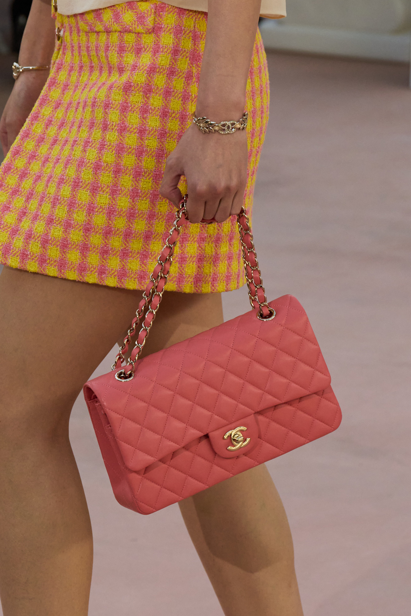 التصميم الكلاسيكي لا يخرج أبداً من الموضة مهما تغيرت المواسم، وهو ثابت وبارز دائماً. نستعرض حقيبة من CHANEL بتصميم كلاسيكي ولكن بلون عصري وردي باستيل. لمن ترغب في تجديد ستايلها مع المحافظة على الكلاسيكية، اختيار اللون الباستيل من أبرز صيحات صيف 2025.
