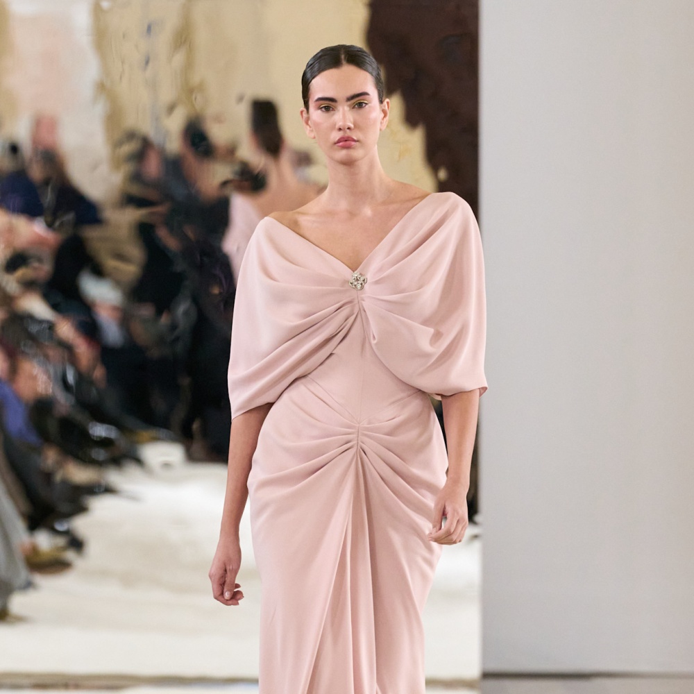 للسهرات الراقية، يأتي فستان Alexis Mabille الحريري الطويل ليضيف فخامة ناعمة إلى إطلالتك. تزيّنه أكمام من التول المنقط، منسدلة وشفافة، لتضفي خفة أنثوية مع بساطة تخطف الأنظار.