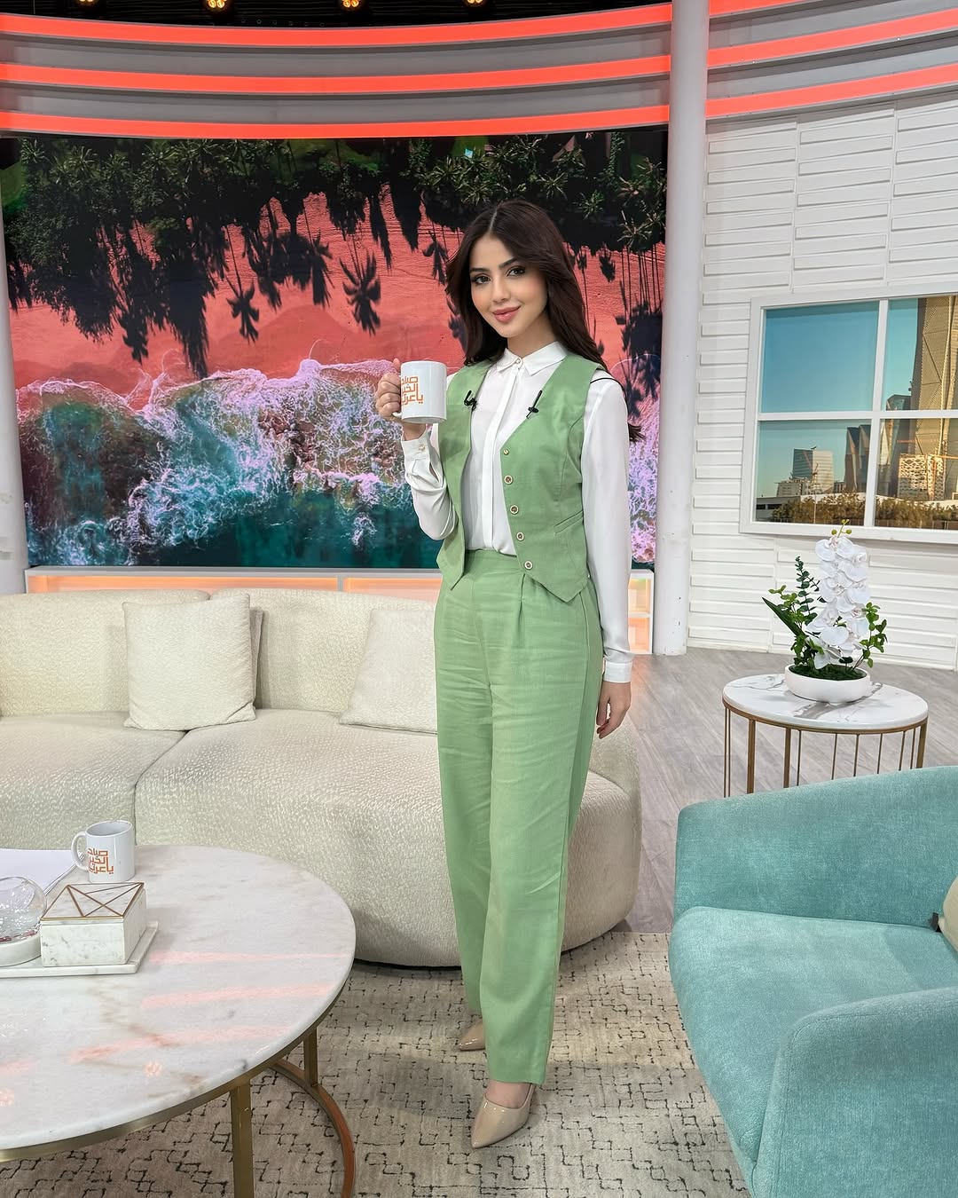 في ظهورها على شاشة "صباح الخير يا عرب"، اختارت نيرمين طقمًا بلون الأخضر الباستيلي مع قميص أبيض كلاسيكي، لتُجسّد بساطة راقية تناسب صباحات العمل.