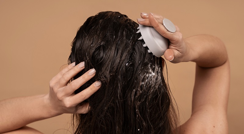 أثناء غسل شعرك، دلكي فروة الرأس بلطف، باستخدام رؤوس أصابعك، بحركات دائرية ناعمة، لتحفيز الدورة الدموية وتفكيك التراكمات الدهنية من دون إيذائها.