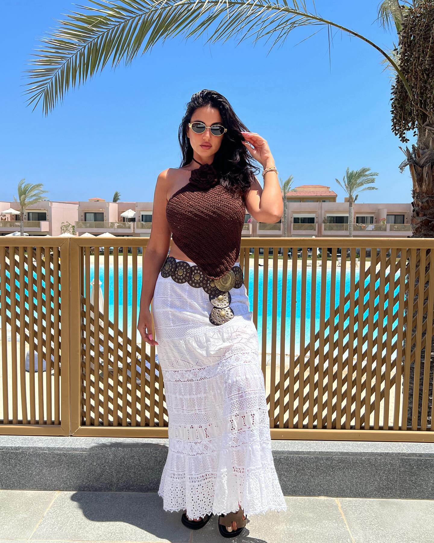في إحدى الإطلالات الشاطئية، ظهرت بفستان كروشيه أبيض شفاف كغطاء لملابس السباحة الزرقاء، بأكمام واسعة وتصميم منسدل. أكملت الإطلالة بحقيبة قش كبيرة من برادا، صندل وردي من كلوي، ونظارات شمسية سوداء كبيرة.