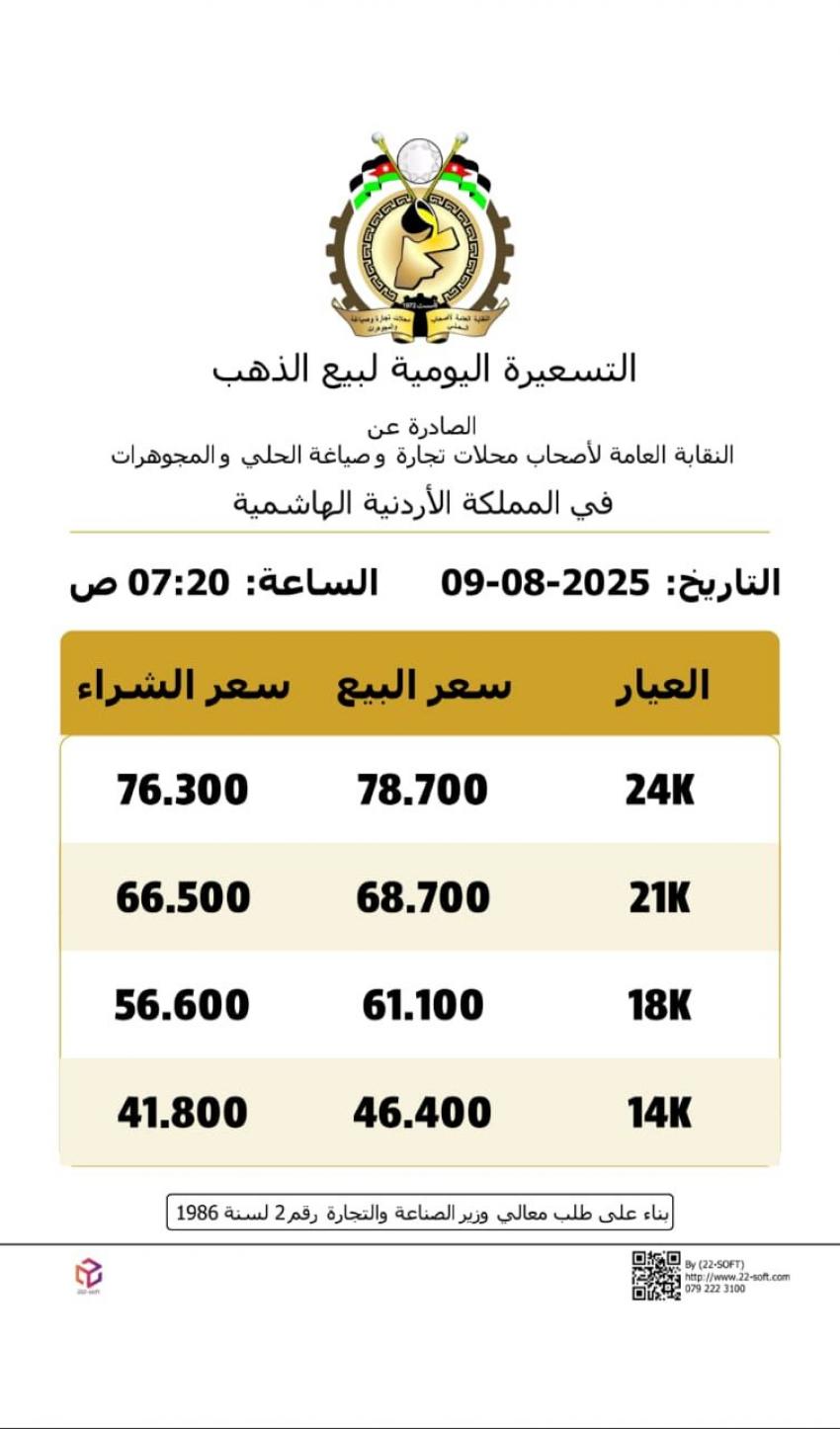 كما بلغ سعر الغرام الواحد من الذهب عيارات 24 و18 و14 لغايات البيع من محلات الصاغة عند 78.70 و 61.10 و 46.40 دينارا على التوالي