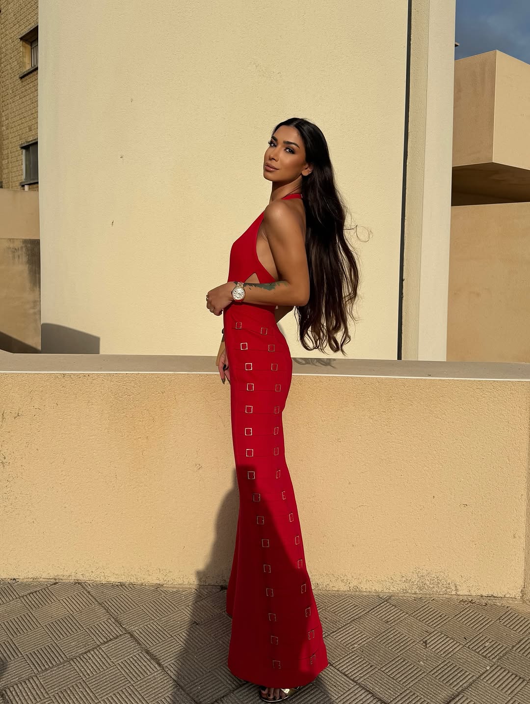 في أحدث إطلالاتها، لفتت تيا الأنظار بجمبسوت أحمر من تصميمها، جمع بين القصّة الجريئة بفتحة صدر عميقة والتفاصيل المعدنية المربّعة على البنطال الواسع بأسلوب عصري. التصميم يعكس جرأتها في ابتكار أزياء تعبّر عن شخصيتها وروح جيل زد، حيث توازن بين الأنوثة القوية والحس الإبداعي. اللون الأحمر الناري زاد الإطلالة قوة وحضور، بينما حافظت على بساطة الأكسسوارات مع حقيبة صغيرة بيج لخلق تباين أنيق.