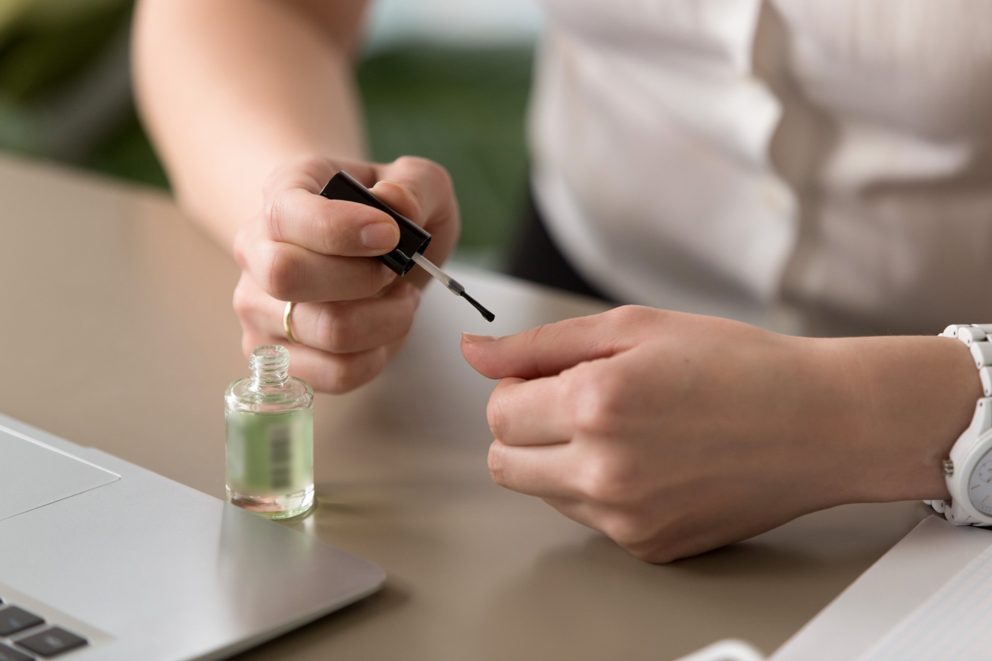 فستان مجسم قصير أبيض على شكل وشاح خلفي وياقة مستديرة سوداء، مع سوار مرصع وخواتم براقة وشعر ويفي منسدل.