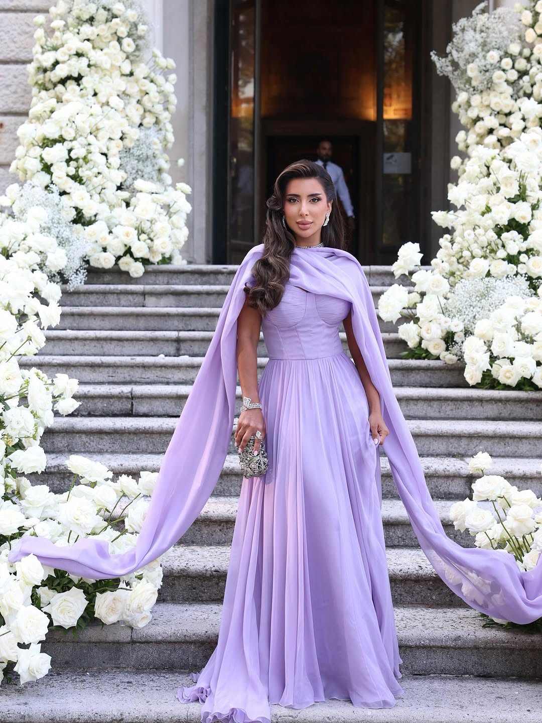 مصممة الأزياء مريم الياسي تألقت بفستان سهرة طويل باللون البنفسجي الفاتح، بقصة كورسيه محدّدة للخصر وتنورة فضفاضة مزينة بثنيات ناعمة، مع وشاح طويل من نفس القماش ينسدل على الكتفين. أكملت مريم الإطلالة بمجوهرات ماسية فاخرة من مارلي وكلتش صغير مرصّع بالورود الكريستالية، وتسريحة شعر ويفي ناعمة مع مكياج برونزي وشفاه نود وردية.