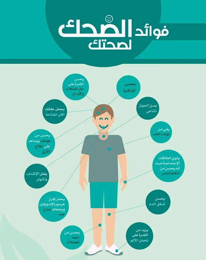 الضحك يقلل من التوتر والقلق، مما يساعدك على الاسترخاء والنوم بشكل أفضل، وبالتالي تحسين صحة الجسم العامة.
