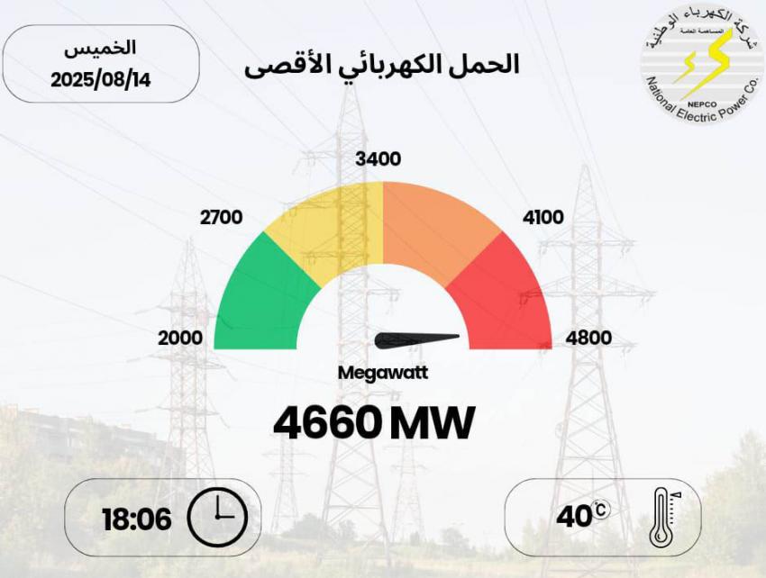 للعلّم - بلغ أقصى حمل كهربائي مسجل، اليوم الخميس، 4660 ميجا واط، بحسب بيانات شركة الكهرباء الوطنية.