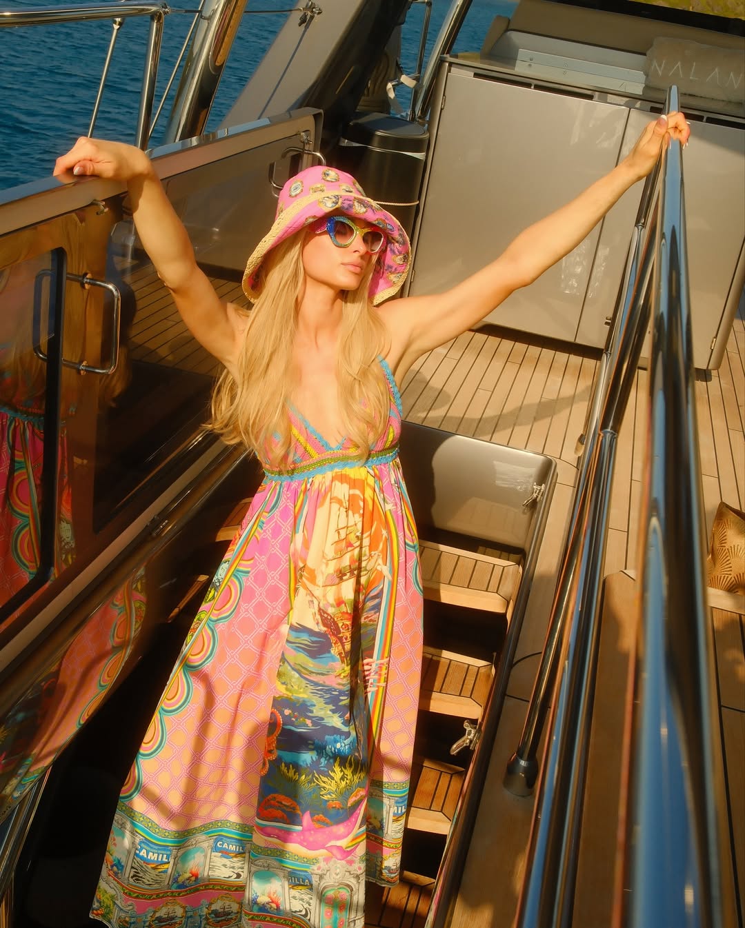 من أكثر الإطلالات الملهمة التي اعتمدتها باريس هيلتون كانت الفساتين الطويلة ذات النقوش المستوحاة من الطبيعة والبحر، بتصميمات فضفاضة مع ياقة واسعة وحمالات رفيعة. نسقتها مع قبعات ملونة ونظارات عصرية لتمنح إطلالتها طابعاً بوهيمياً يعكس أجواء الصيف.