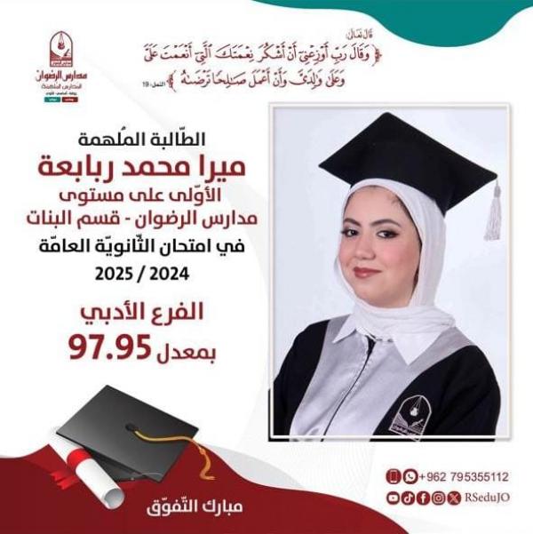 للعلّم - يتقدم محمد بدير وعقيلته سجود الحياصات بأسمى آيات التهنئة والتبريك لابنة خالته ميرا محمد ربابعة بمناسبة النجاح في الثانوية العامة "التوجيهي" بامتياز وحصولها على معدل 97.95% ٪..