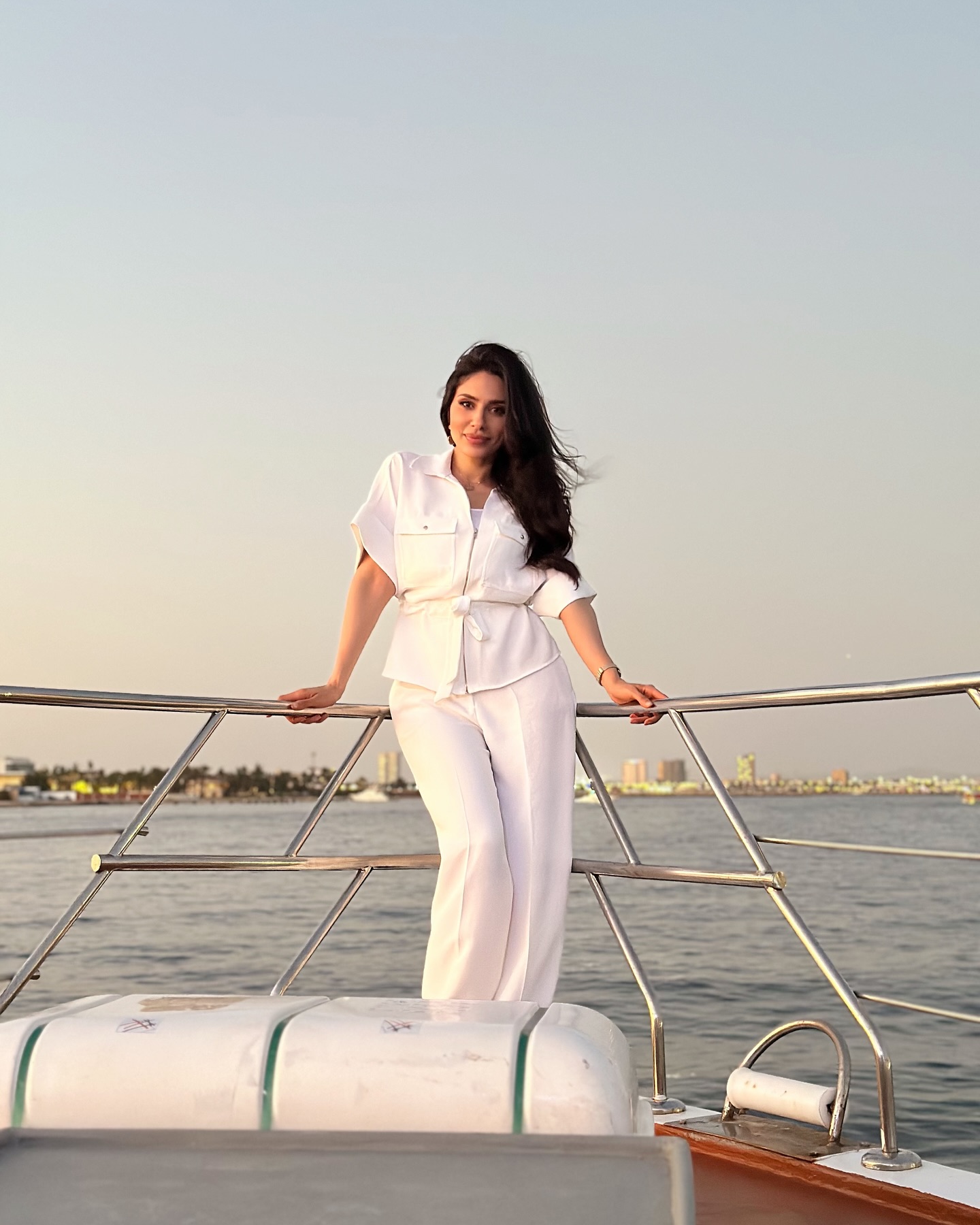 طقم أبيض عملي: قميص بأكمام قصيرة مطوية وجيوب على الصدر، حزام قماشي لتحديد الخصر، بنطال واسع الأرجل، مظهر عملي وراقي على متن يخت.