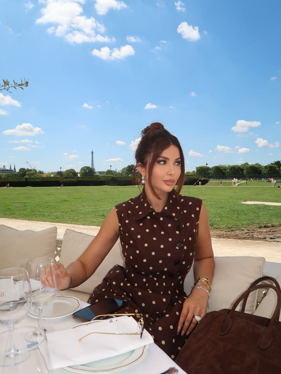 اعتمدت باولا الست فستان قصير بني بحمالات عريضة وفتحة جانبية، مع نقاط بولكا باللون البيج، وحقيبة مخملية بنية، وأكسسوارات ذهبية مكدسة، وتسريحة كعكة عالية، ونظارة شمسية.
