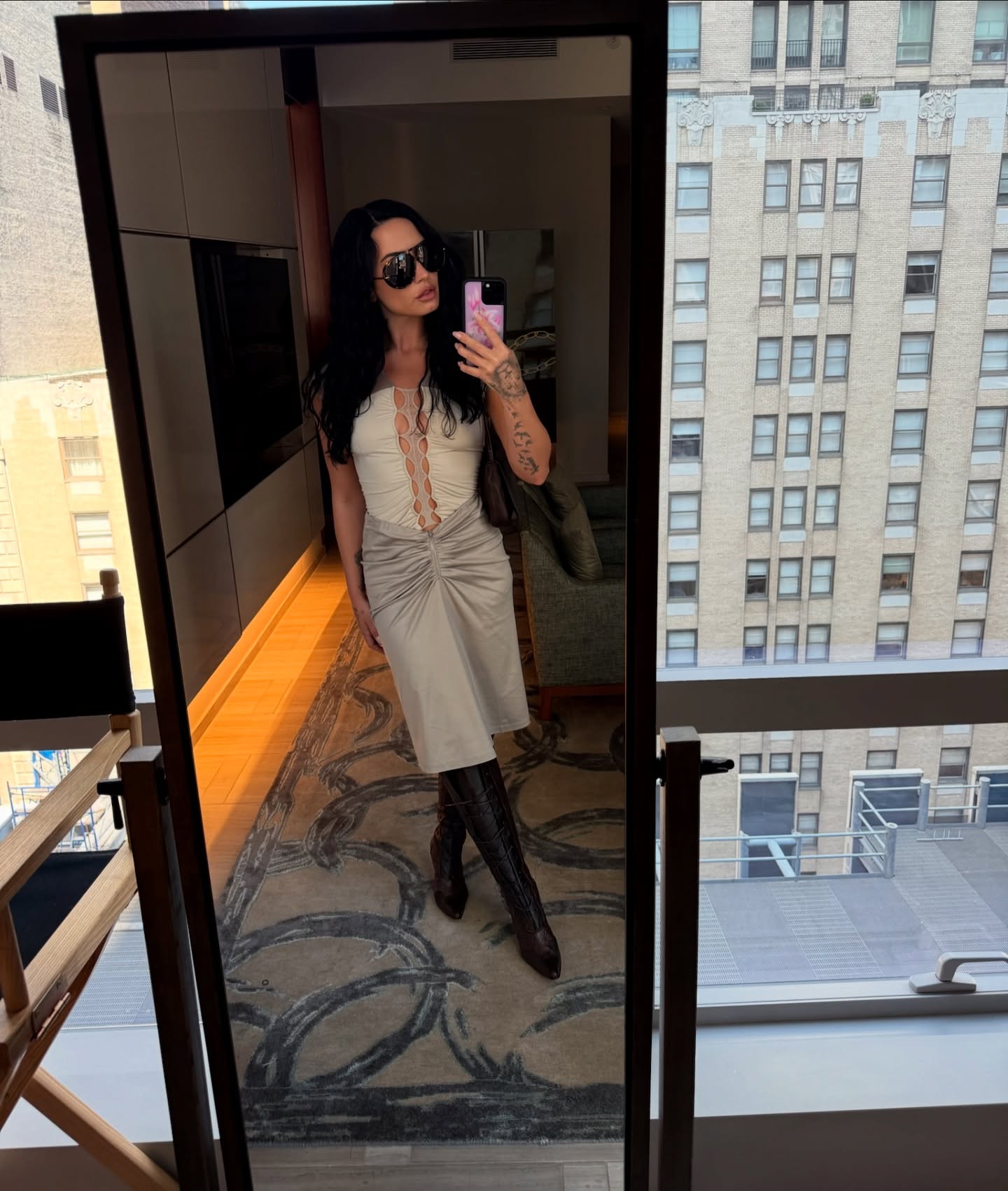 في أحد ظهورها في شوارع نيويورك، ارتدت توب قصير بيج بأكمام طويلة وفتحة عنق V مع عقدة أمامية كشفت عن البطن، منسق مع بنطلون أسود ضيق بخصر مرتفع، وحذاء أسود لامع بكعب عالٍ، مع نظارات شمسية كبيرة.