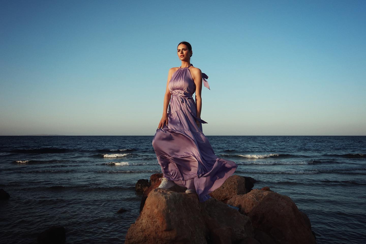 اختارت فستانًا من توقيع Reem Salama بلون بنفسجي فاتح، يتميز بقصة هالتر وربطة كبيرة على الكتف، مع خصر مزموم وتنورة واسعة. المفاجأة كانت الحذاء الرياضي الأبيض الذي أضفى لمسة عصرية غير متوقعة.
