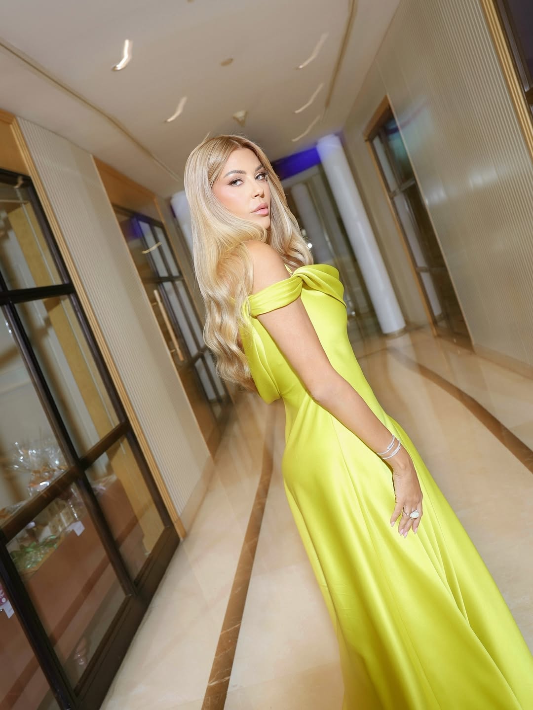 الإعلامية اللبنانية كارلا حداد اختارت فستان مونوكروم من توقيع zmileleeofficial باللون الأصفر الليموني، تصميم طويل انسيابي مع فتحة جانبية عالية، وكتف ناعم وانسياب قماش الساتان الذي يعكس الضوء.