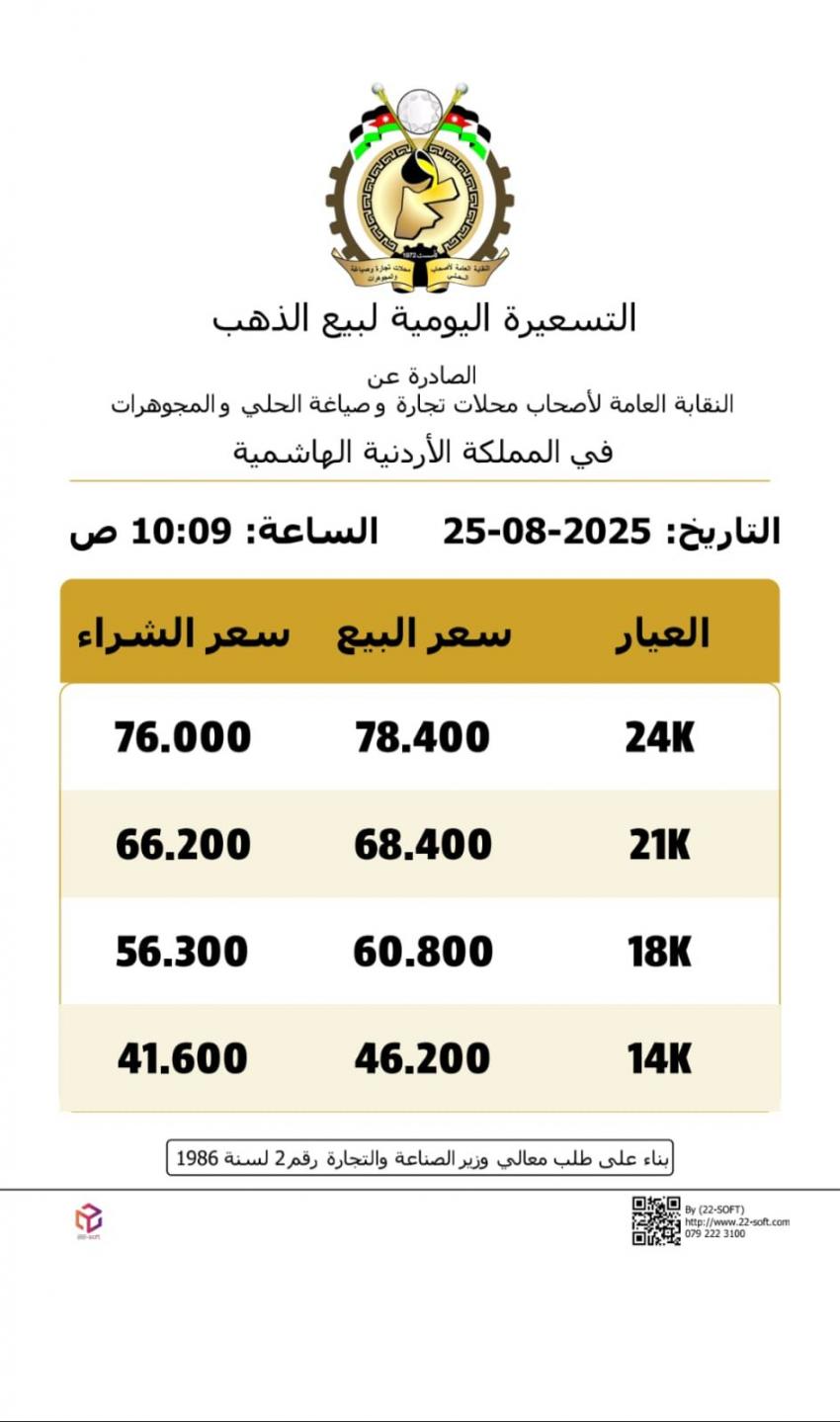 فيما بلغ سعر الغرام الواحد من الذهب عيارات 24 و18 و 14 لغايات البيع من محلات الصاغة عند 78.40 و 60.80 و 46.20 دينار على التوالي.