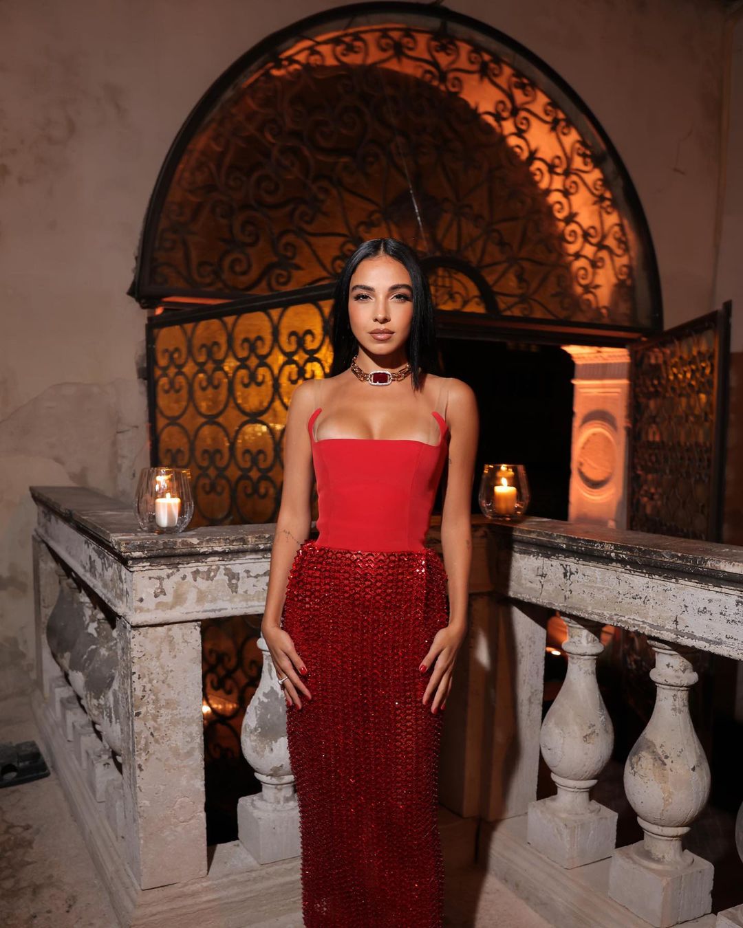 سلمى اختارت فستانًا أحمر من توقيع جورج حبيقة بقصة الأكتاف المكشوفة والخصر المحدد بأسلوب الكورسيه، وتنورة مستقيمة مزينة بتطريزات براقة بأسلوب هندسي، أكملت اللوك بصندل عالي ملتف حول الكاحل وحقيبة فضية.