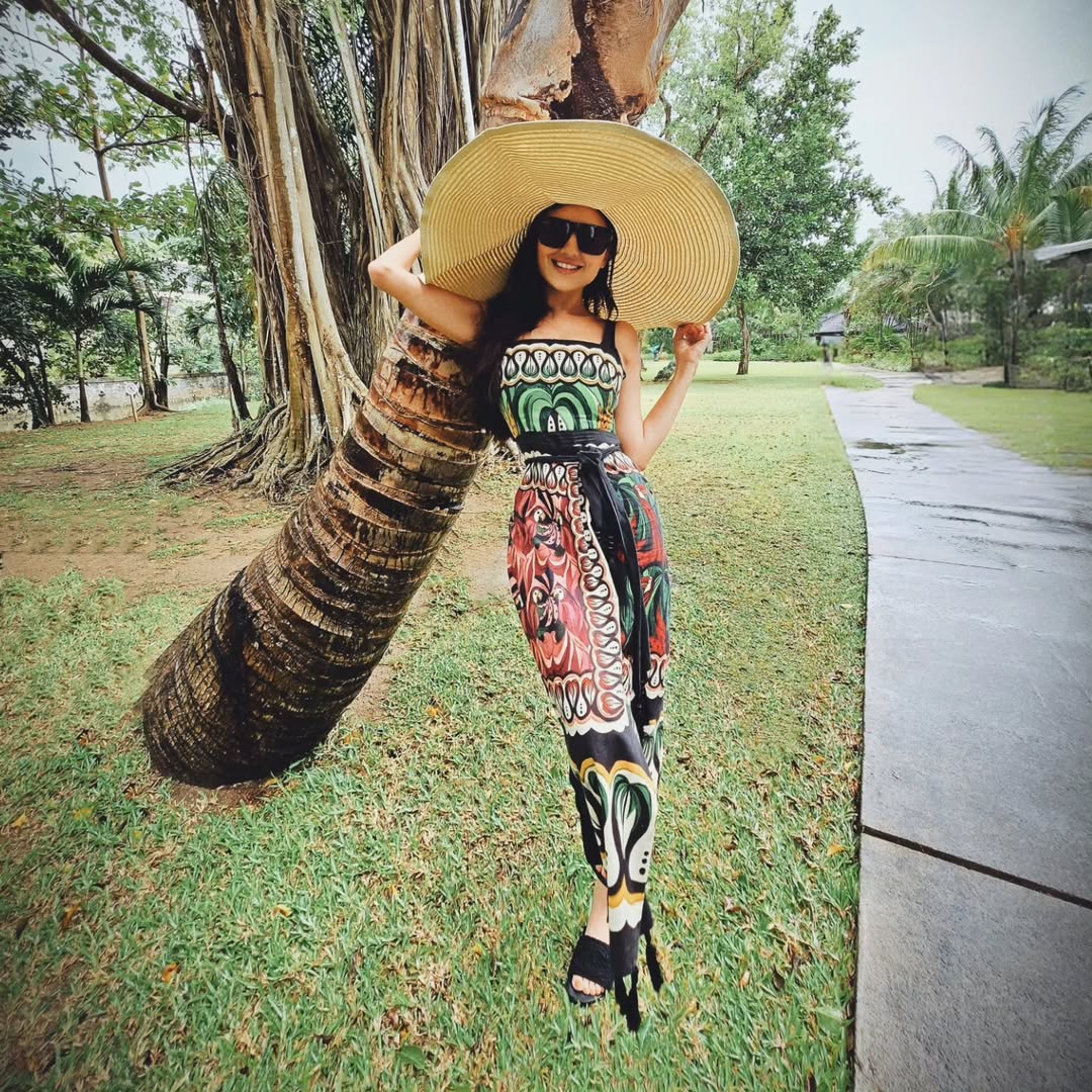 وعلى شاطئ المالديف، ارتدت طقماً مقلمًا باللون الأبيض مع خطوط بنية، مكون من بنطلون واسع وكروب توب بياقة هالتر، وحملت حقيبة Loewe كبيرة باللون الخردلي، مع قبعة شبكية من القش وصندل فيشرمان.