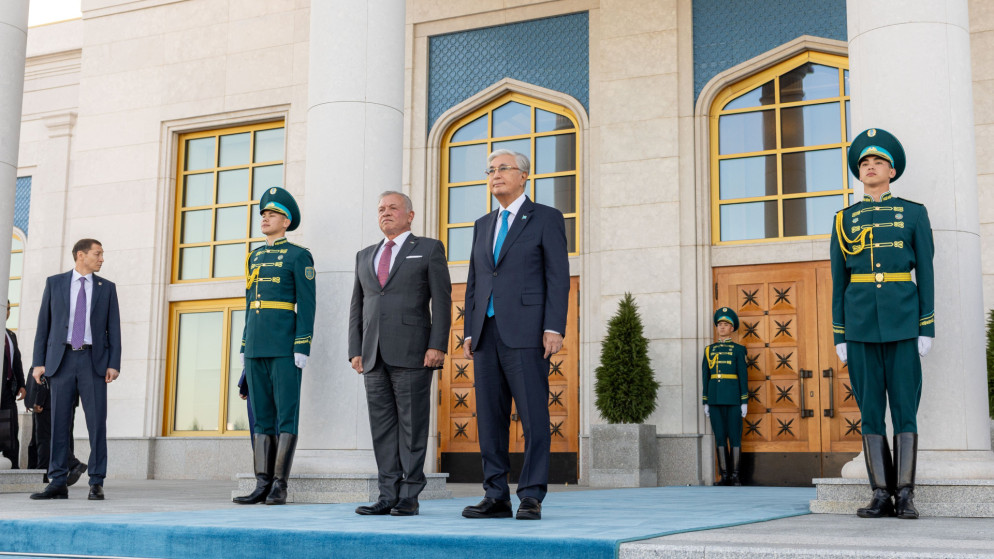 للعلّم - استقبل رئيس جمهورية كازاخستان قاسم جومارت توكاييف جلالة الملك عبدالله الثاني لدى وصول جلالته إلى مطار نور سلطان نزارباييف الدولي.