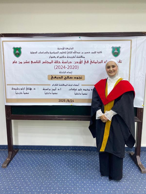 للعلّم - يتقدم الأهل والأصدقاء بأجمل عبارات التهنئة والتبريكات إلى الغالية الدكتورة نجود الدبعي بمناسبة حصولها على درجة الدكتوراه في العلوم السياسية، وبتقدير امتياز من كلية الأمير حسين بن عبدالله الثاني للدراسات الدولية في الجامعة الأردنية، بعد إيجاز أطروحتها والمعنونة ب " تقييم الأداء البرلماني في الأردن: دراسة حالة المجلس التاسع عشر 2020-2024" بنجاح من قبل لجنة المناقشة.