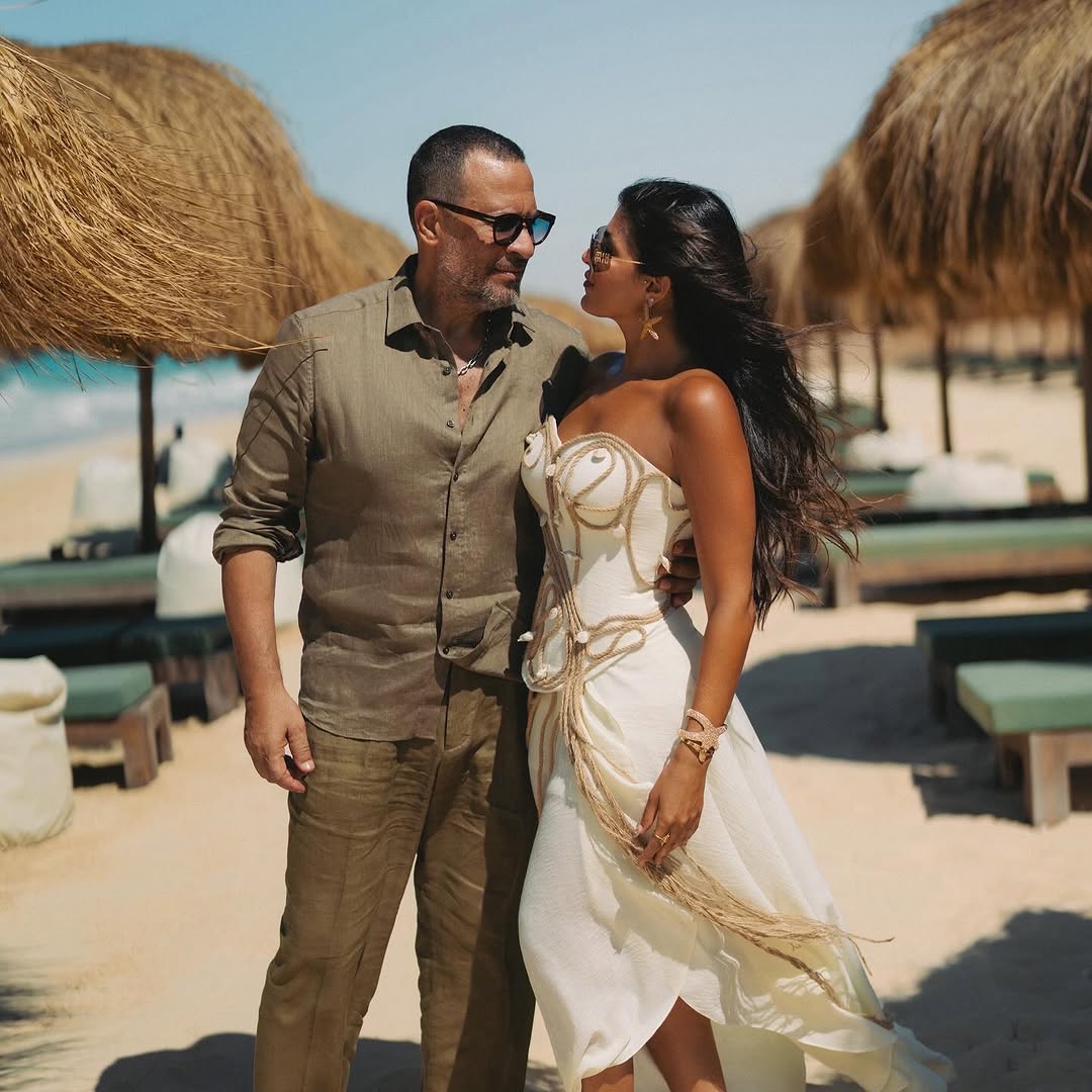 في أحدث ظهور لهما على الشاطئ، خطفت مصممة الأزياء رانيا النصر الأنظار بلقطات رومانسية خلال إجازتهما، حيث تألقت بفستان أبيض انسيابي بقصّة كورسيه من دون أكمام، مزين بتطريزات حبال تلتف من الأعلى إلى الخصر وتنتهي بشراشيب ناعمة تضفي لمسة فنية تناسب الأجواء الساحلية. أكملت رانيا اللوك بأقراط ذهبية كبيرة وسوار رفيع ونظارات شمسية أنيقة، مع تسريحة شعر مموج طبيعي ومكياج برونزي دافئ بلمسة هايلايتر.