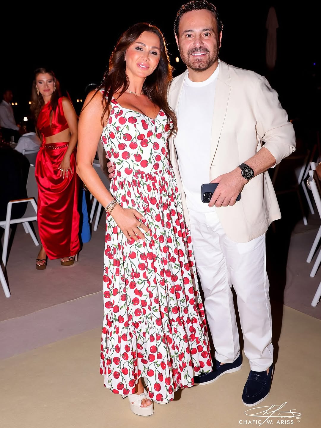 أما عاصي الحلاني فاختار بليزر أوف وايت فوق تيشيرت وبنطال أبيض مع حذاء لوفر كحلي وساعة فاخرة، في تناغم يعكس أجواء العطلة الرومانسية.