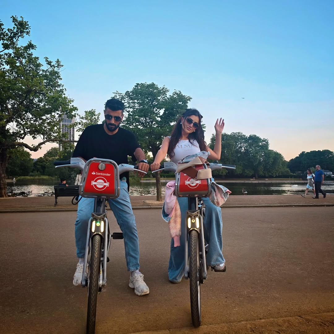 وفي ظهور آخر، اعتمد الثنائي ملابس جينز كاجوال خلال جولة بالدراجات الهوائية، عاكسين المرح والانسجام الذي يميز حياتهما الزوجية.