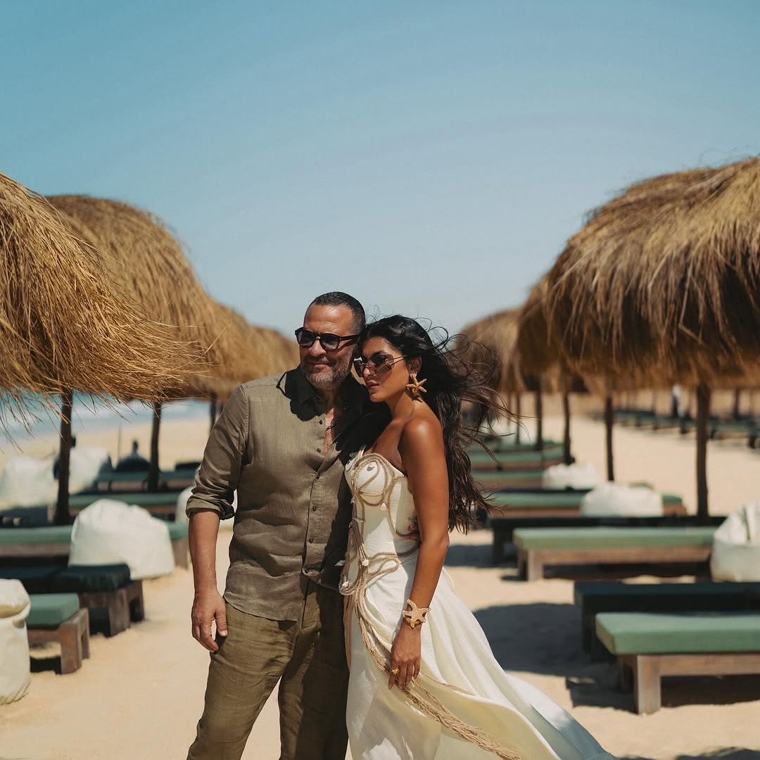 أما ماجد المصري فاختار قميصًا وبنطال كتان بلون زيتوني فاتح، ليكمل التناغم اللوني مع زوجته، ويظهرا كثنائي منسجم يفيض بالرومانسية.