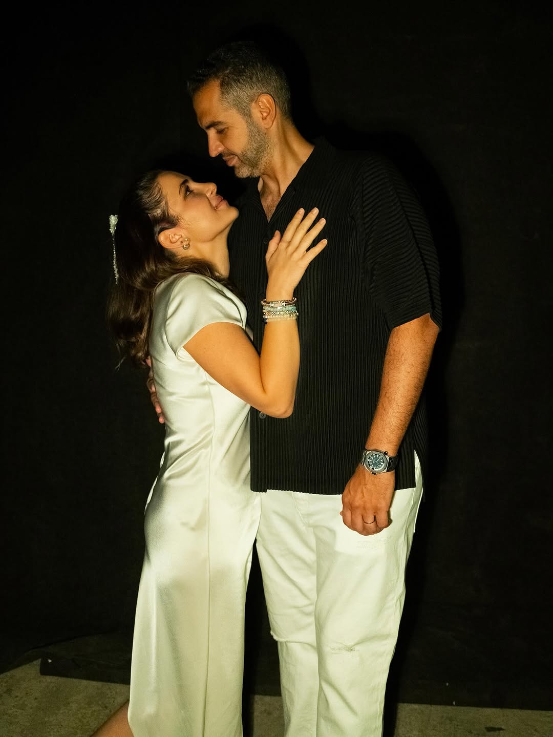 زوجها أحمد هلال اعتمد قميصًا أسود بخطوط طولية دقيقة مع بنطال أبيض وساعة يد فاخرة، ليكملا معًا صورة رومانسية أنيقة تنضح بالانسجام.