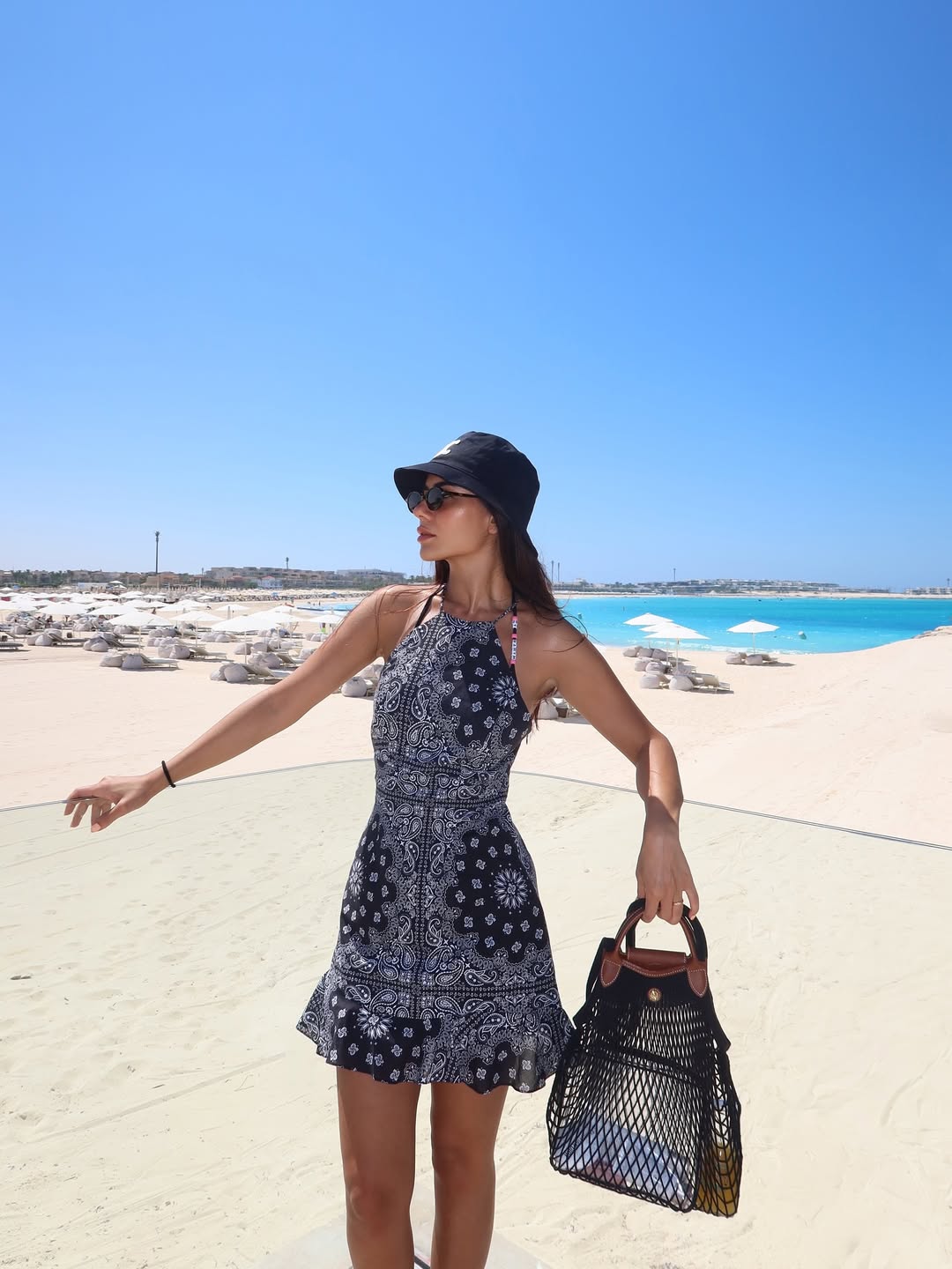 هنا الزاهد تألقت على الشاطئ بإطلالة باللون الزهري المزين بالنقش المخروطي وانحناءات الدمعة والدوامات السوداء على بنطلون واسع مع كروب توب بياقة الهالتر بتصميم مربع مائل. نسقت الإطلالة مع حقيبة كتف كبيرة من الرافيا وصندل بني مسطح، واعتمدت النظارات الشمسية والشعر المنسدل بعفوية.