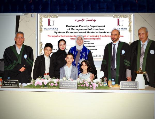 للعلّم - ناقشت الباحثة ساره زيد محمد السلامة الزعبي/رئيس شعبة الاحصاء في قسم المعلومات التابع لمديرية الغذاء في المؤسسة العامة للغذاء والدواء يوم أمس الإثنين رسالتها الموسومة بـِ " The impact of business intelligence tools on improving e-marketing in Jordanian telecommunications companies " و ذلك استكمالاً لحصولها على درجة الماجستير بدرجة الامتياز في تخصص Smart Business من جامعة الاسراء.