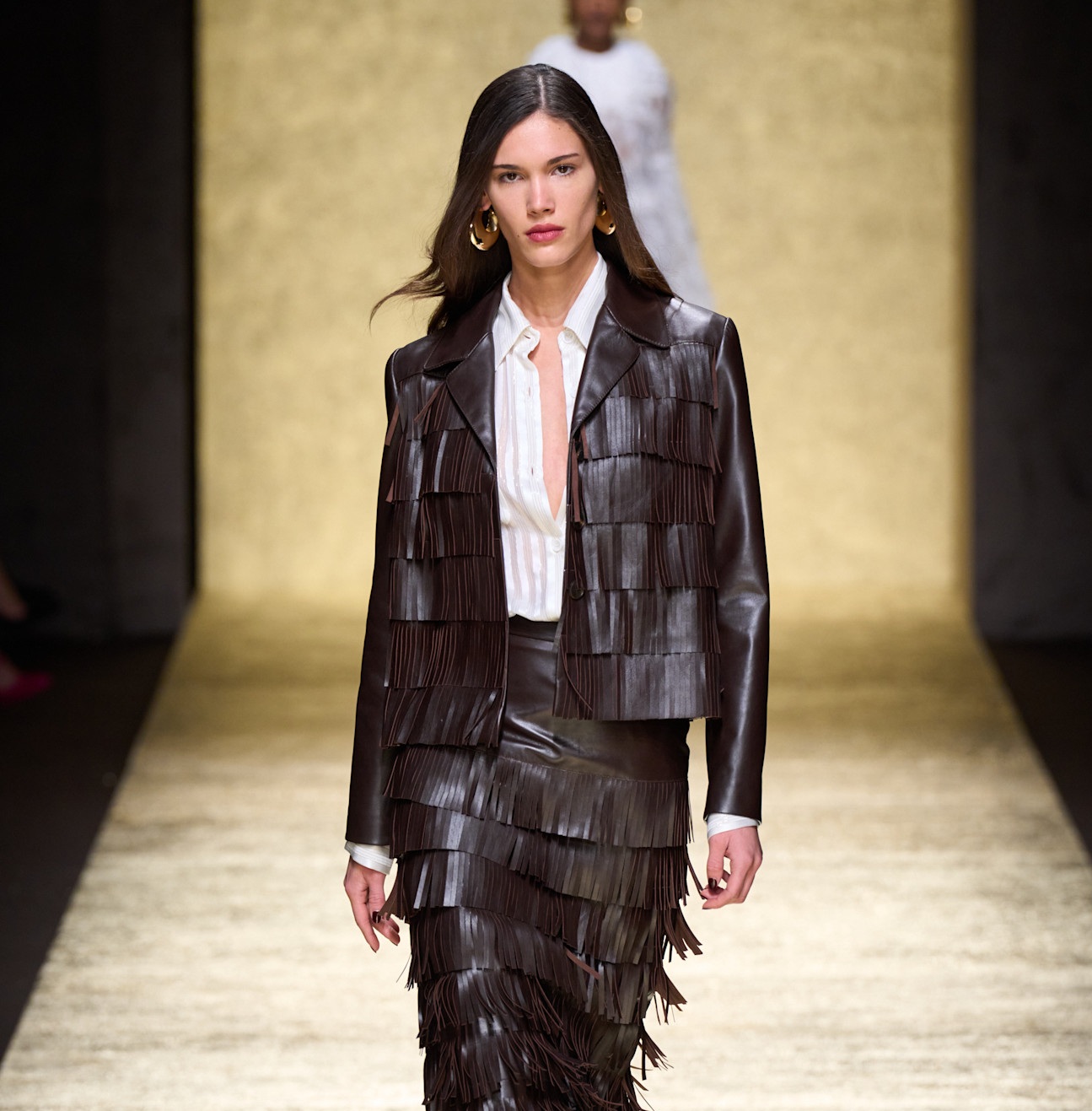 التنانير الجلدية الطويلة باللون البني مع طبقات من الشراريب القصيرة تمنح إطلالة أنثوية غير محددة القوام. يليق بها التوب البني الضيق مع أكمام كلوش واسعة لإطلالة متكاملة بأسلوب دار Luisa Spagnoli.