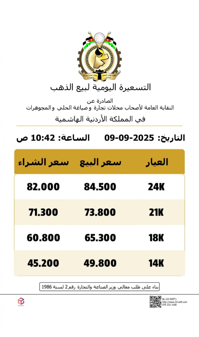 وبلغ سعر بيع الغرام الواحد من الذهب عيارات 24 و18 و14 لغايات الشراء من محلات الصاغة، عند 84.5 و65.3 و 49.8 دينارا على التوالي.
