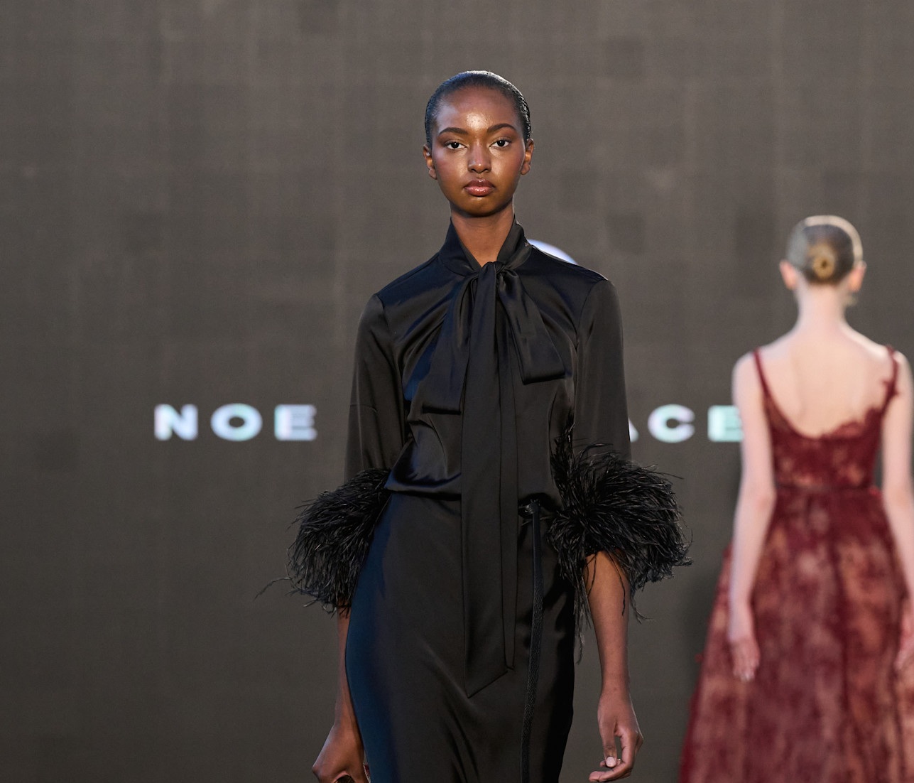 دار Noe Bernecelli أضافت لمسة درامية باستخدام الريش على الأكمام مع أقمشة مات ناعمة، وقصة كلاسيكية عند الياقة. خيار مثالي لعاشقات التميز.