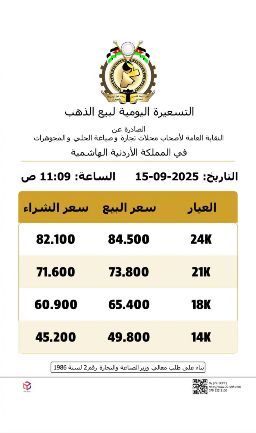 فيما بلغ سعر بيع الغرام الواحد من الذهب عيارات 24 و18 و14 لغايات الشراء من محلات الصاغة، عند 84.5 و65.4 و49.8 دينارا على التوالي.