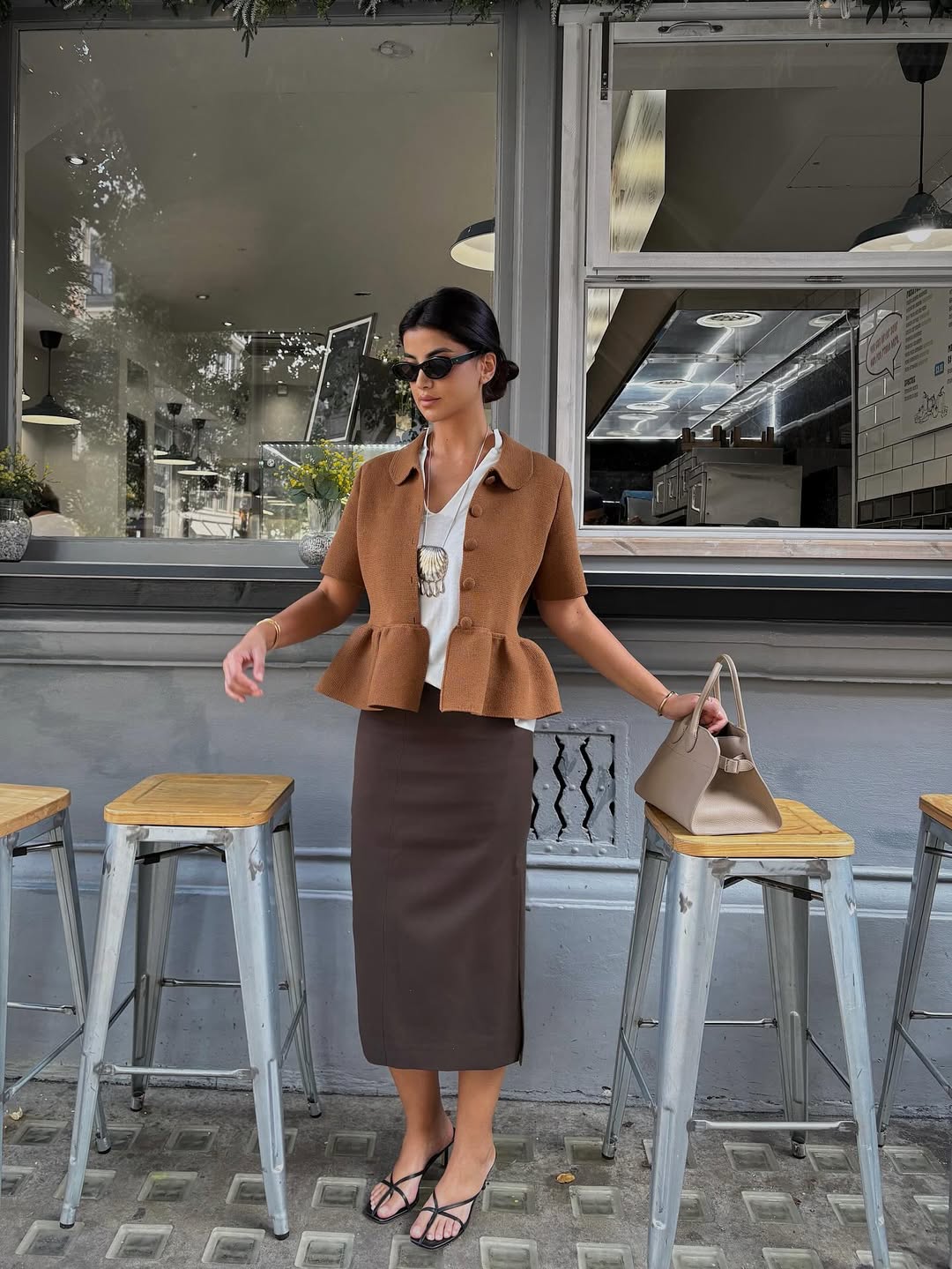علا فرحات: تنورة بنسل ميدي بني داكن، توب أبيض، وجاكيت صوفي بني فاتح بقصة كلوش مع كشكش وأكمام قصيرة، وصندل بالأربطة السوداء، وحقيبة بيج، وتسريحة كعكة منخفضة، مع قلادة طويلة.