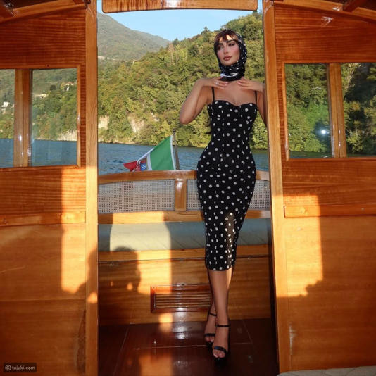 في إطلالة ثالثة، عادت نور الغندور لتثبت أن التنوع هو سر نجاحها في عالم الموضة، حيث اختارت فستاناً أسود ميدي منقطاً بالدوائر البيضاء بتصميم مجسم يبرز رشاقتها. ولتكمل اللوك، لم تعتمد على قبعة هذه المرة بل على وشاح من نفس النقشة، ما جعل الإطلالة متناغمة بالكامل.