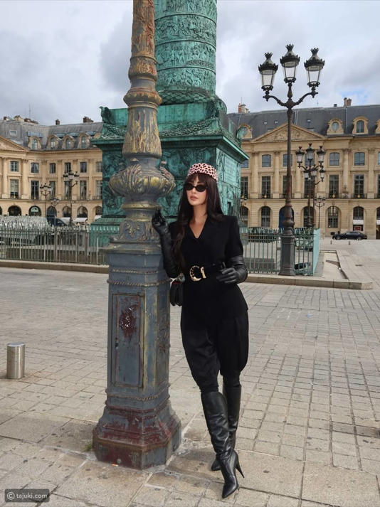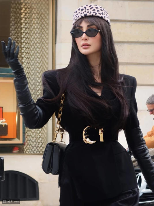 أما الإطلالة الثانية فكانت أكثر جرأة وعمقاً في الطابع الباريسي، حيث اعتمدت نور على لوك مستوحى من ملابس الفروسية يجمع بين الكلاسيكية والجرأة، مع بلايزر بحزام عريض وشورت أسود بوف، وبوط جلدي طويل. لكن التفصيل الذي منح الإطلالة شخصيتها المميزة كان اختيارها قبعة صوف مستديرة بنقشة الفهد باللونين البيج والأسود.