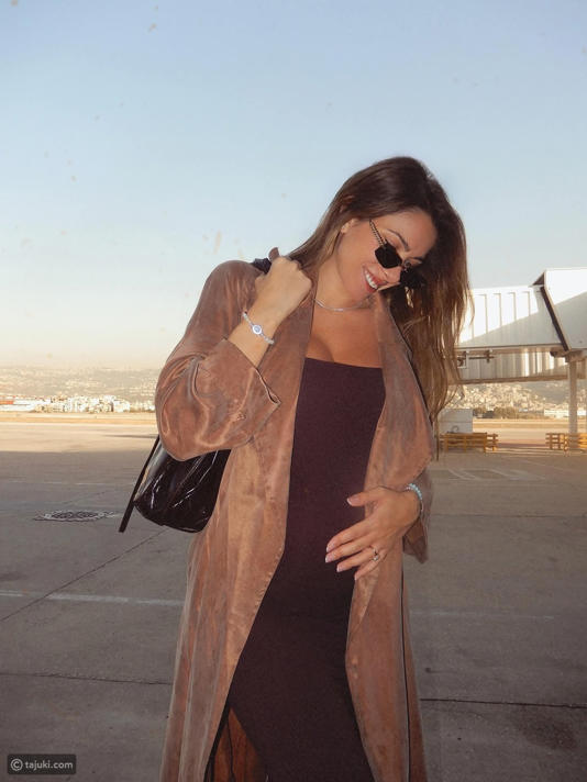 م تكتمل إطلالتها من دون الإكسسوارات الفخمة الناعمة؛ فقد ارتدت سواراً ماسياً ونظارات شمسية صغيرة، وأضفت حقيبة يد لامعة من دار Fendi لمسة من العصرية، محوّلة الإطلالة من يومية بسيطة إلى مظهر أنيق ومتكامل. هذه الإطلالة تعكس كيفية تحويل ملامح التغيير الطبيعي أثناء الحمل إلى عنصر جمالي يبرز أنوثة المرأة وجمالها الداخلي والخارجي.
