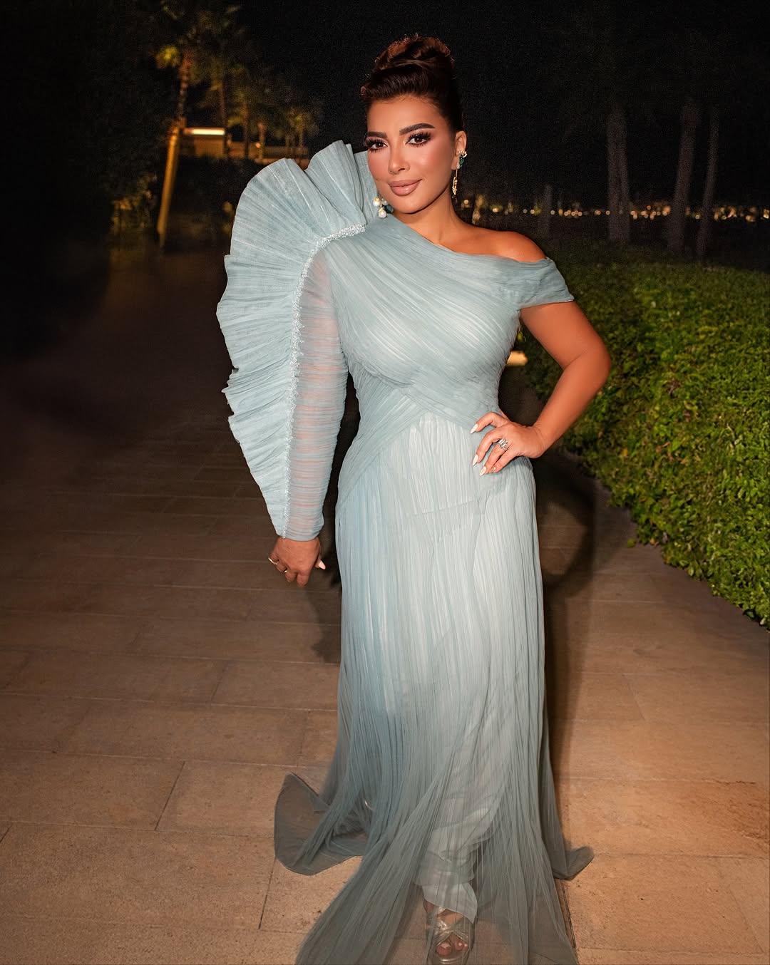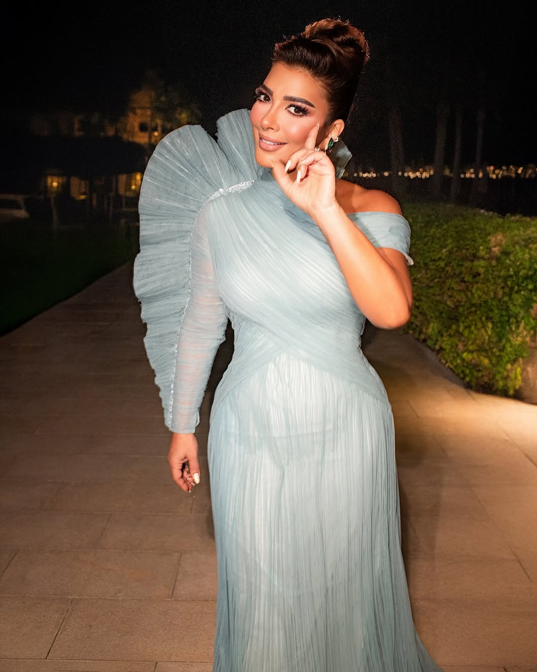 أصالة نصري: فستان معماري باللون الأزرق الضبابي