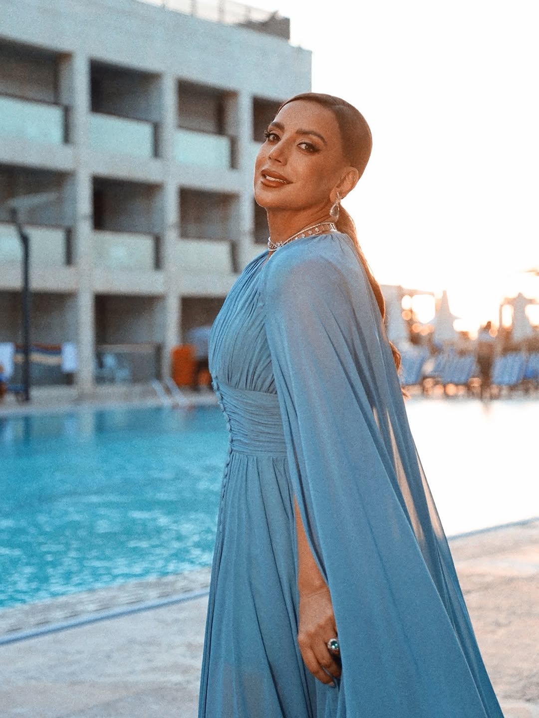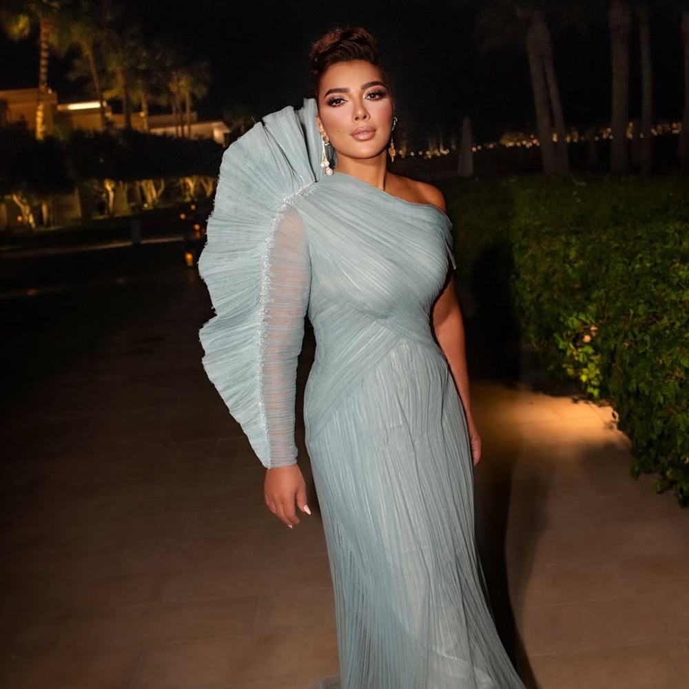 الممثلة اللبنانية ريان حركة اختارت فستان حورية البحر الأزرق المائي من توقيع بيتر عبد الكريم، مزين بالترتر والخرز البراق مع فتحة جانبية عالية وتصميم على شكل قلب عند الصدر. أكملت الإطلالة بمجوهرات ناعمة وتسريحة شعر كراميل منسدلة، مع مكياج عيون برونزي وشفاه نيود طبيعية، لتجمع بين الجرأة والأنوثة.