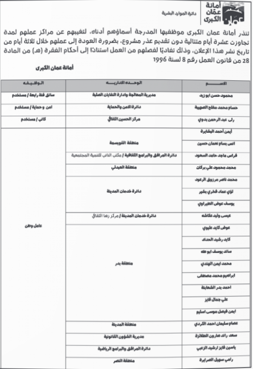 للعلّم - أنذرت أمانة عمان الكبرى موظفيها المدرجة أسماؤهم أدناه، لتغيبهم عن مراكز عملهم لمدة تجاوزت عشرة أيام متتالية دون تقديم عذر مشروع، بضرورة العودة إلى عملهم خلال ثلاثة أيام من تاريخ الإعلان تفاديا لفصلهم.