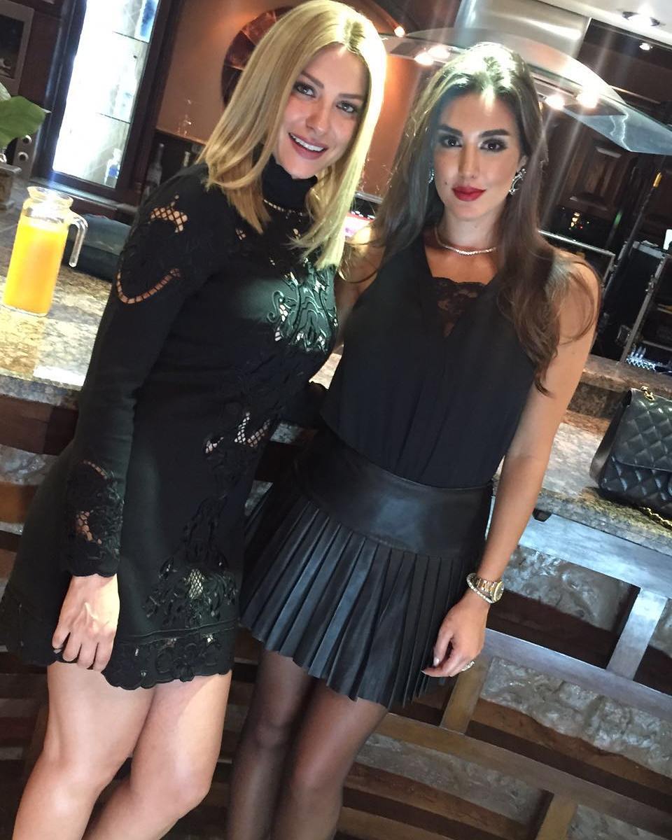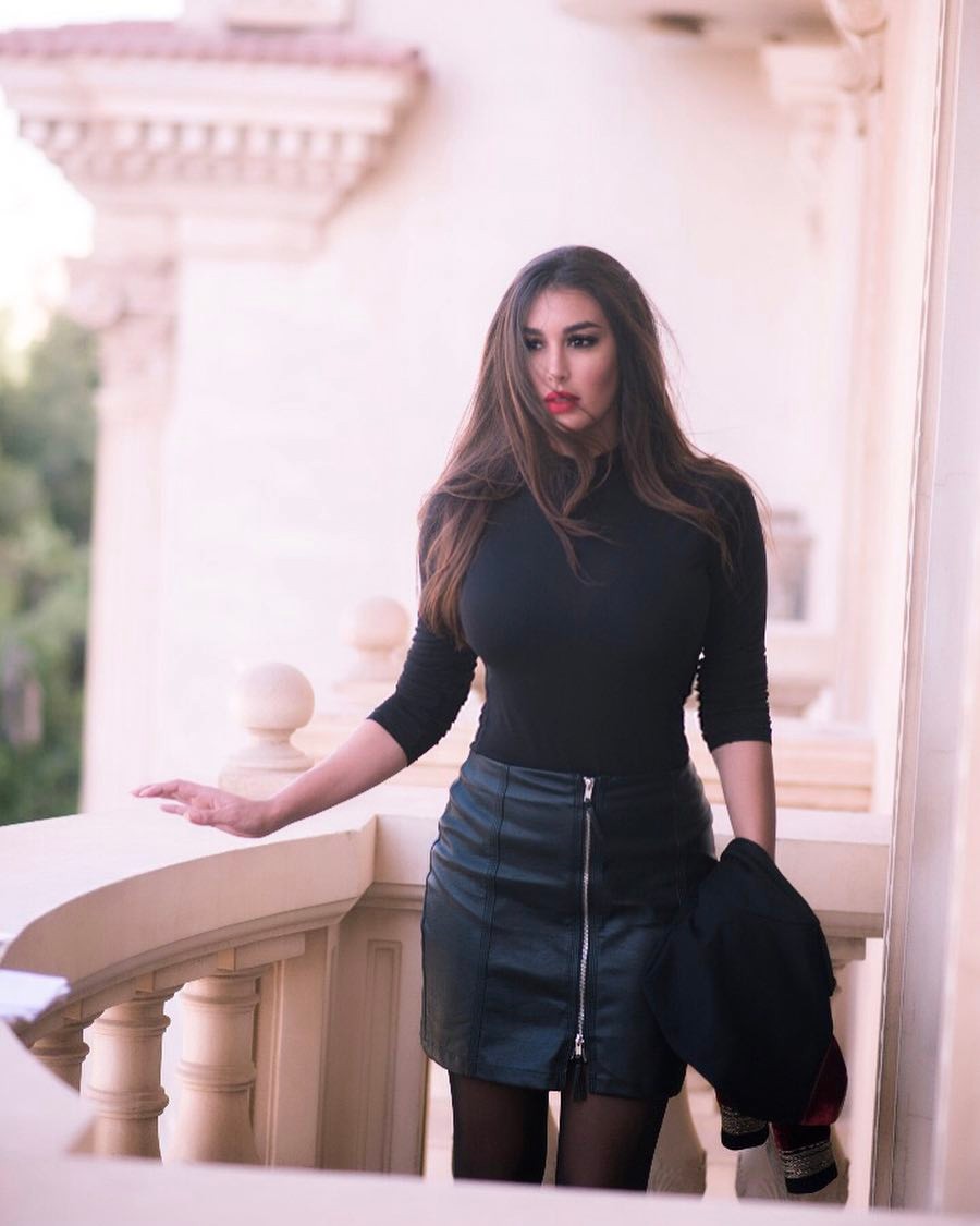 اللوك الأسود الكامل: ظهرت بتنورة قصيرة من الجلد الأسود مزودة بسحاب أمامي، مع بلوزة ضيقة بأكمام ثلاثة أرباع، وجوارب شفافة سوداء، لتبرز رشاقتها وتمنح الإطلالة لمسة أنثوية جريئة.